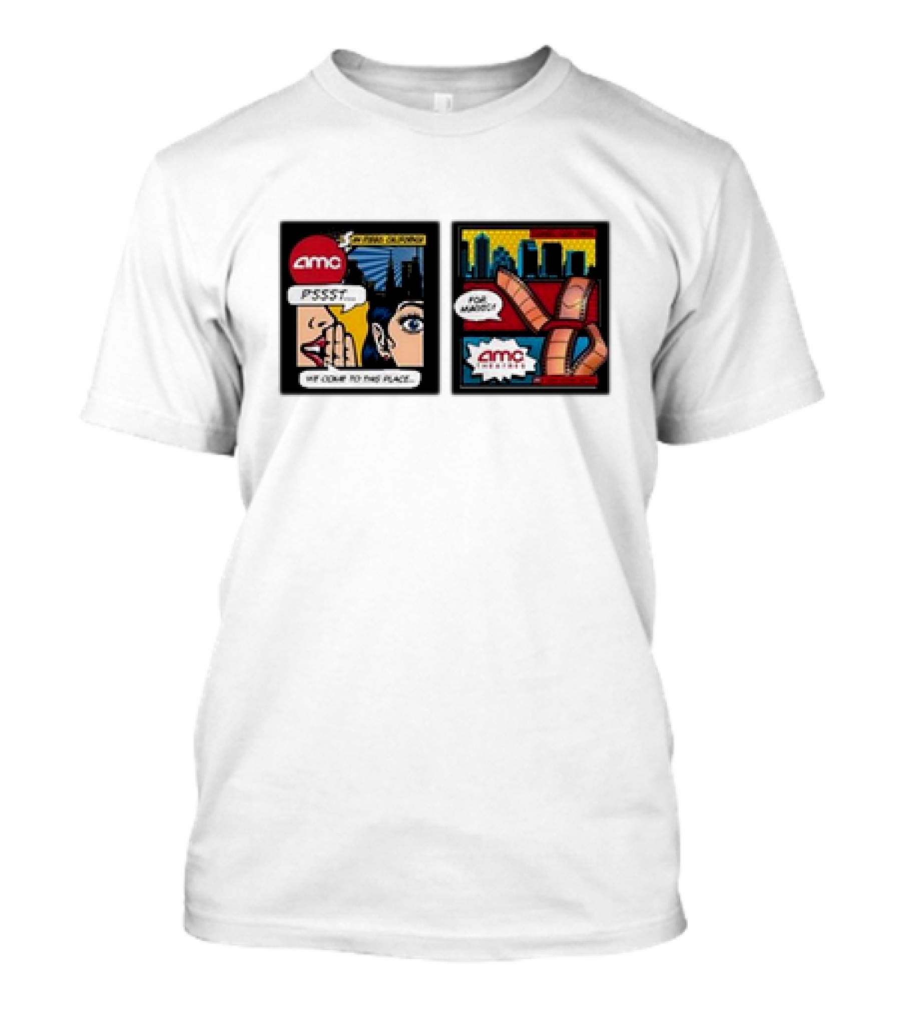 The AMC Theatres San Diego California Pssst We Come to This Place for Magic Comic Style Pop T-shirt is designed for everyday wear and a consistent fit. Fabric is pre-shrunk ring-spun cotton with durable stitching. See the size chart below for exact measurements.