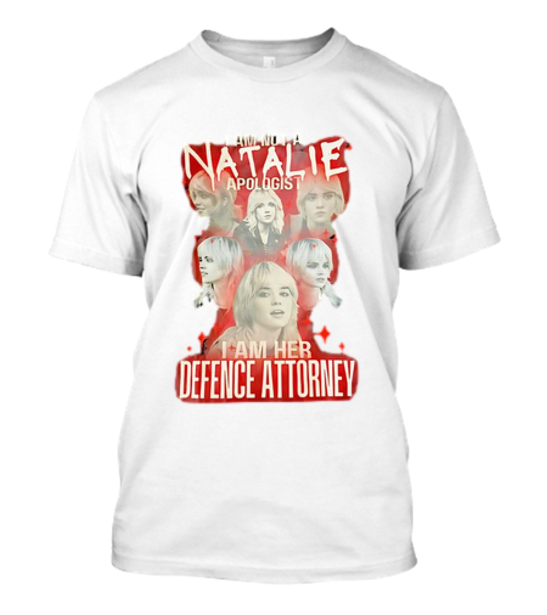 The I Am Not a Natalie Apologist I Am Her Defence Attorney Red Star Collage T-shirt is designed for everyday wear and a consistent fit. Fabric is pre-shrunk ring-spun cotton with durable stitching. See the size chart below for exact measurements.