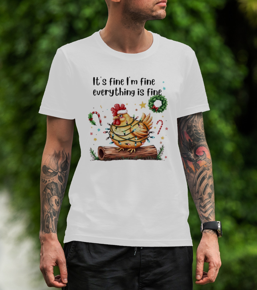 The It's Fine I'm Fine Everything Is Fine Merry Christmas Chicken Lights Candy Canes Wreath T-shirt is designed for everyday wear and a consistent fit. Fabric is pre-shrunk ring-spun cotton with durable stitching. See the size chart below for exact measurements.