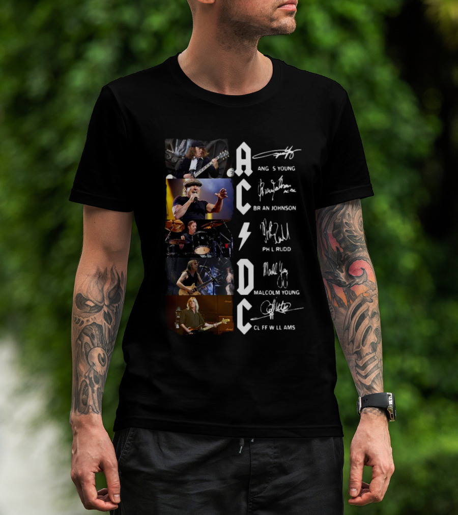 AC DC Angus Young Brian Johnson Phil Rudd Malcolm Young Cliff Williams Signatures Photos T-Shirt