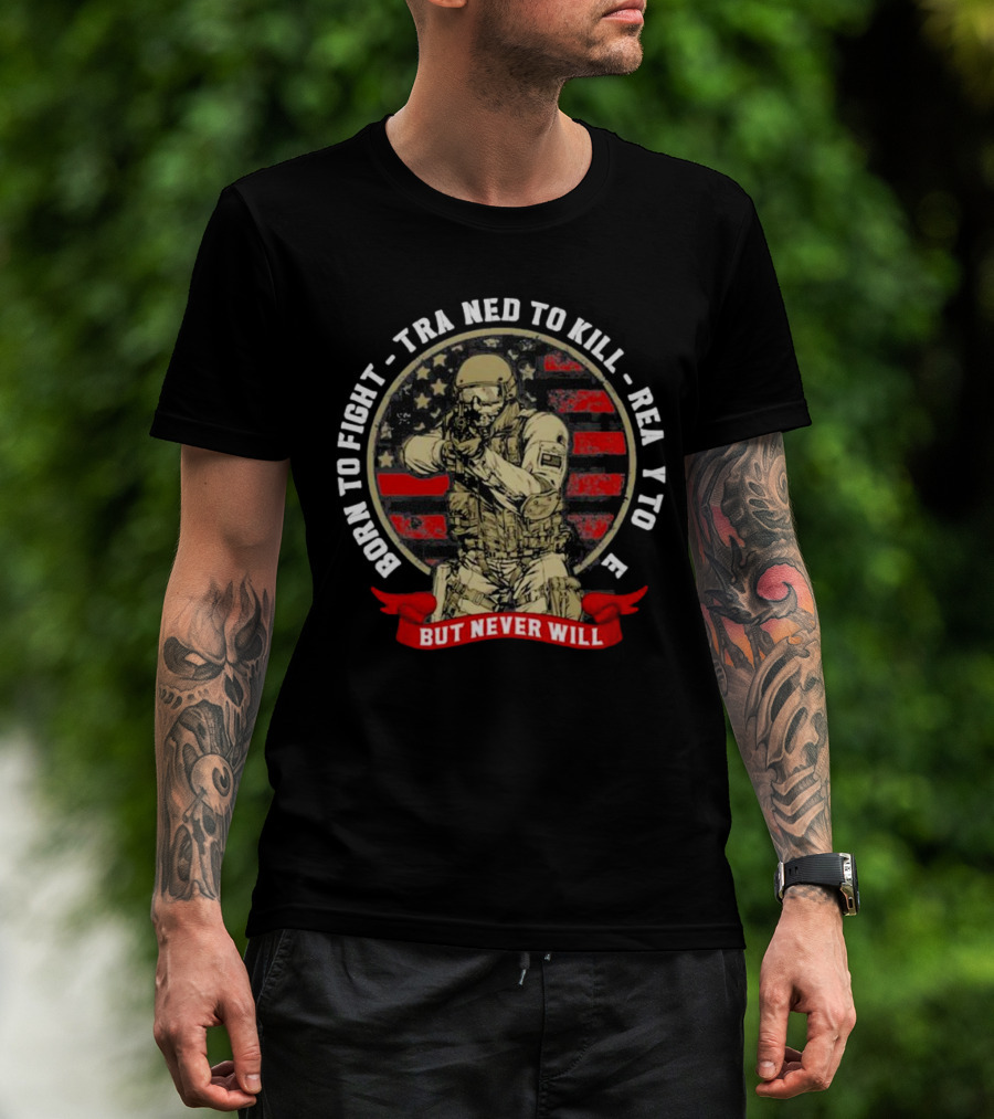 Born To Fight Trained To Kill Ready To Die But Never Will American Flag Tactical Soldier T-Shirt