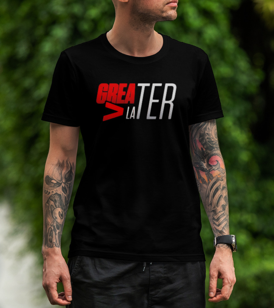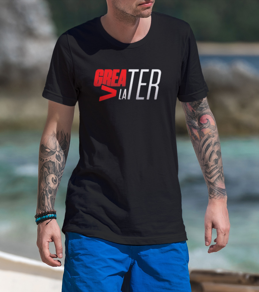 The GREATER > LATER T-shirt is designed for everyday wear and a consistent fit. Fabric is pre-shrunk ring-spun cotton with durable stitching. See the size chart below for exact measurements.
