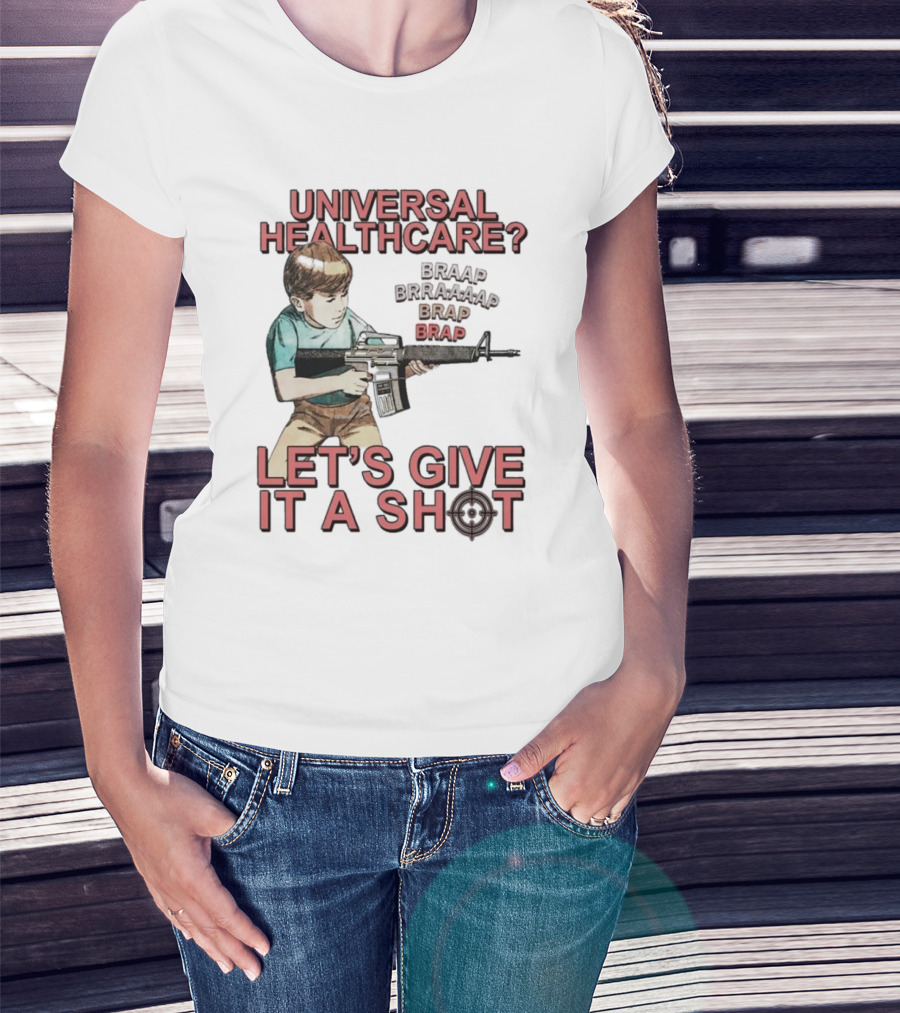 The Universal Healthcare Let's Give It A Shot Braap Brraaap Brap Kid With Gun T-shirt is designed for everyday wear and a consistent fit. Fabric is pre-shrunk ring-spun cotton with durable stitching. See the size chart below for exact measurements.
