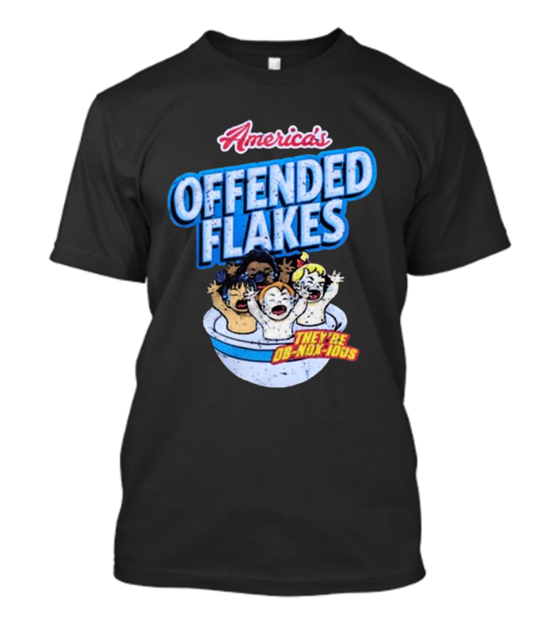 The America's Offended Flakes They're Ob Nox Ious Derrick Holland T-shirt is designed for everyday wear and a consistent fit. Fabric is pre-shrunk ring-spun cotton with durable stitching. See the size chart below for exact measurements.