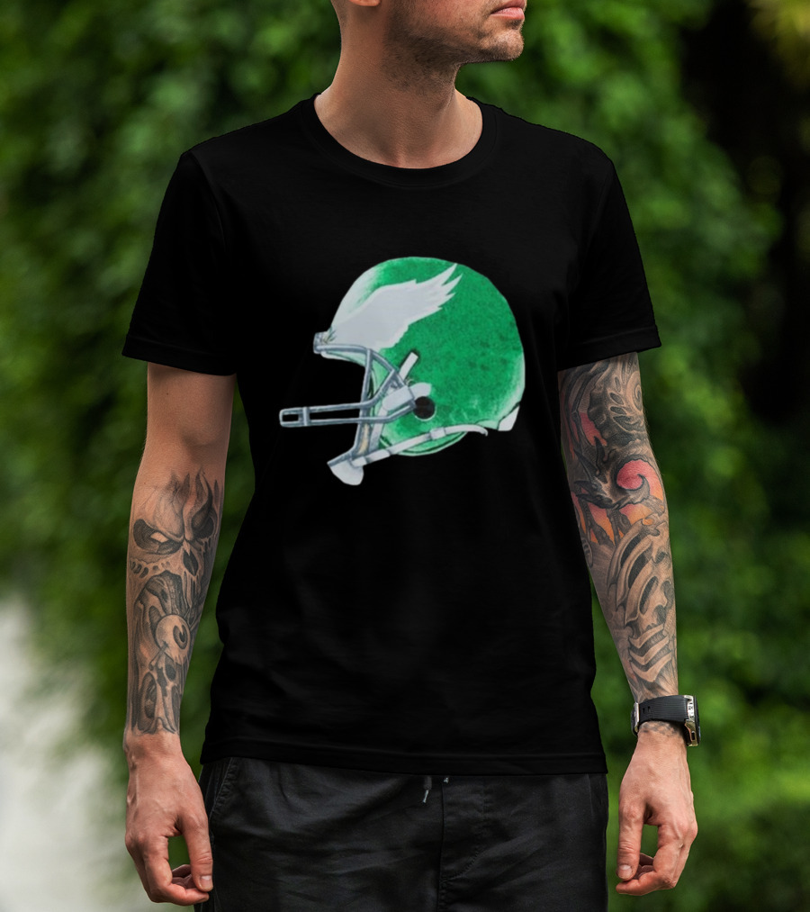 The Eagles Green Winged Football Helmet T-shirt is designed for everyday wear and a consistent fit. Fabric is pre-shrunk ring-spun cotton with durable stitching. See the size chart below for exact measurements.