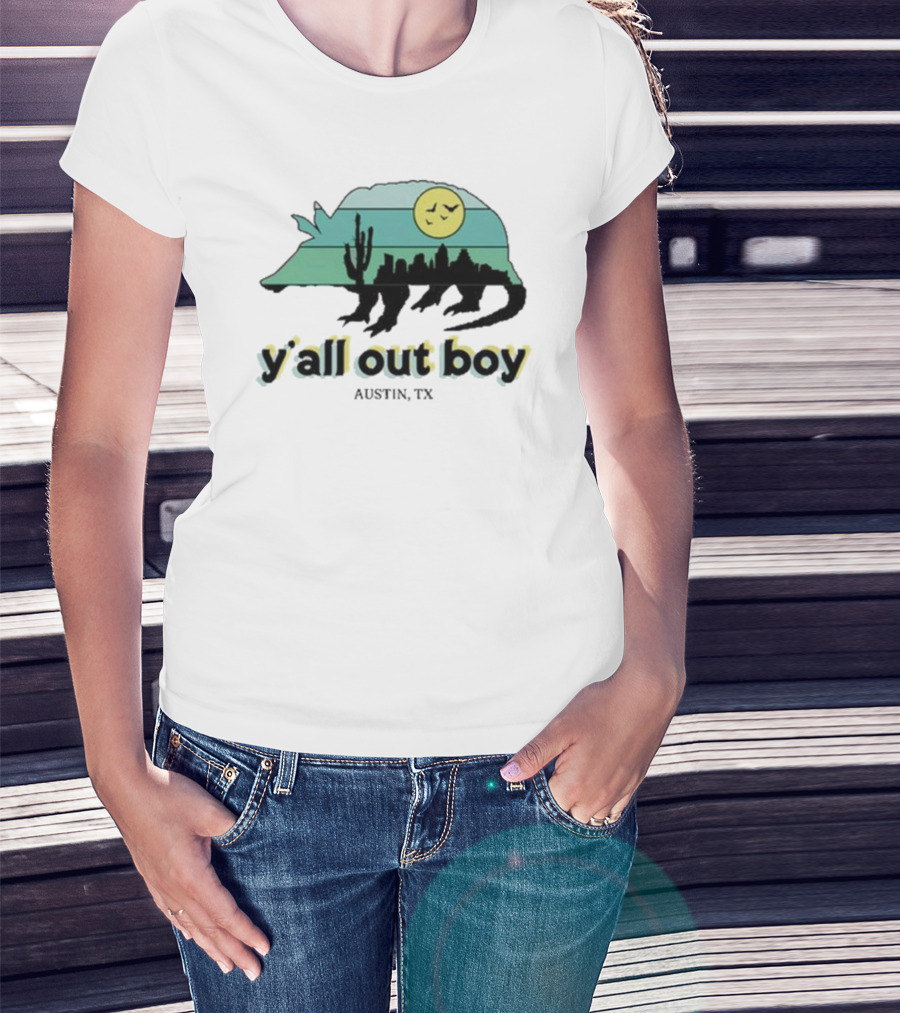 Y'all Out Boy Armadillo Austin TX Blue Gold Cactus Moon Skyline T-Shirt