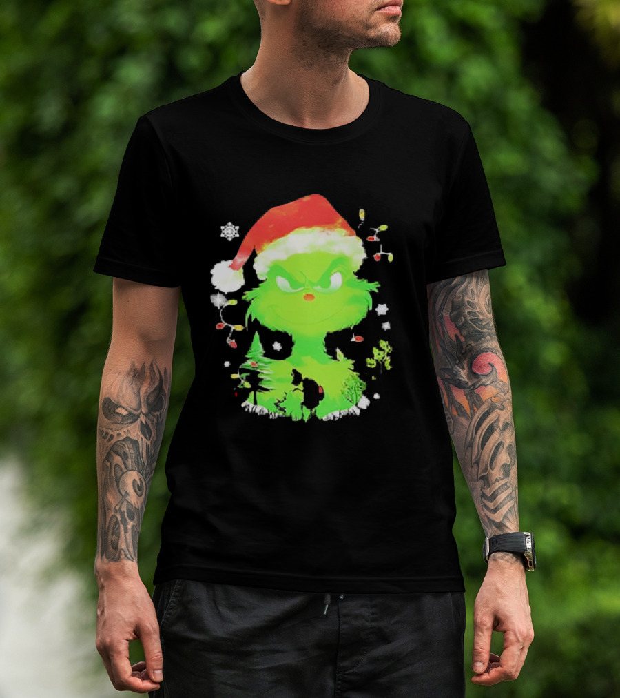 The Grinch in Santa Hat Surrounded by Snowflakes and Christmas Lights T-shirt is designed for everyday wear and a consistent fit. Fabric is pre-shrunk ring-spun cotton with durable stitching. See the size chart below for exact measurements.