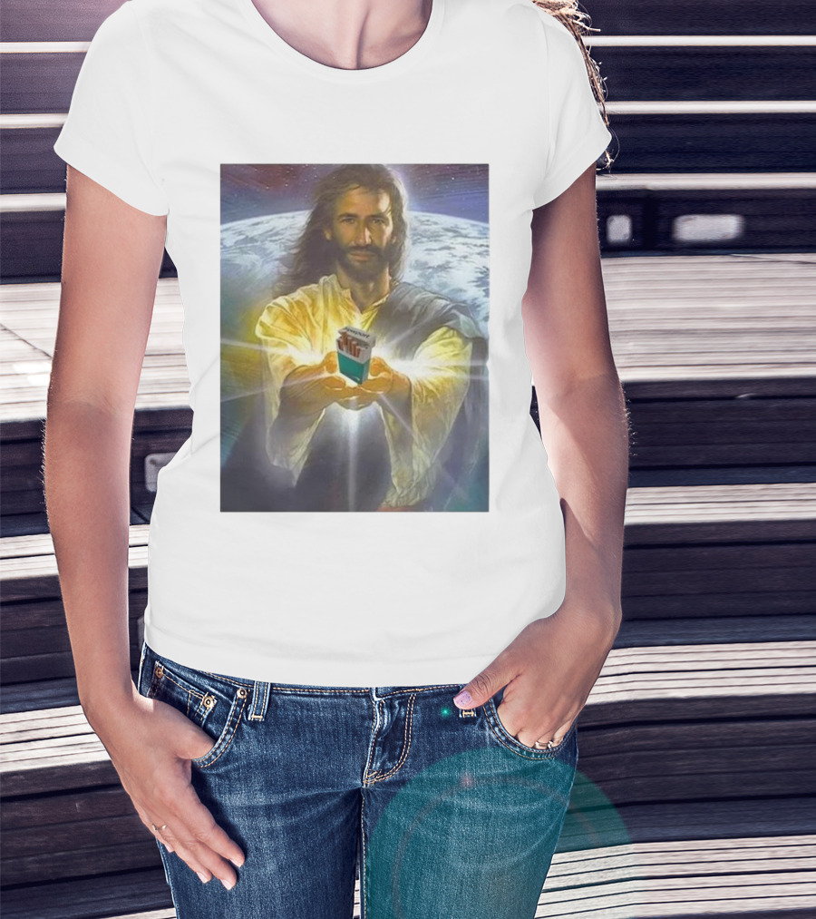 Jesus Offering Marlboro Cigarettes On Cosmic Background T-Shirt