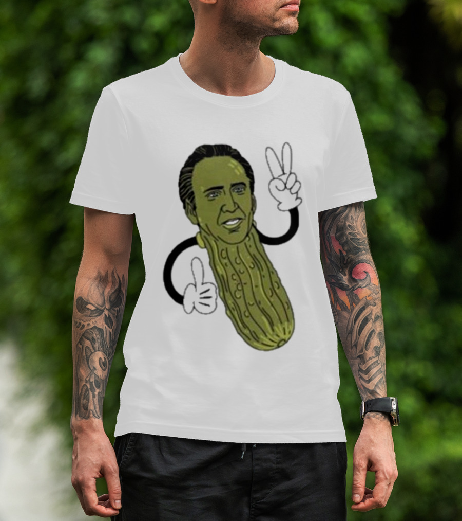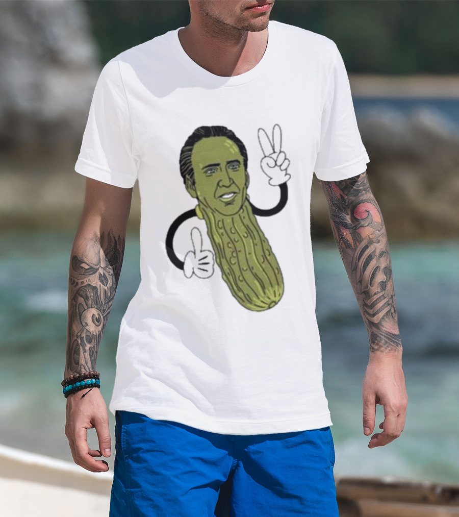 The Picolas Cage Nick Cage Pickle Character with Peace Sign Christmas T-shirt is designed for everyday wear and a consistent fit. Fabric is pre-shrunk ring-spun cotton with durable stitching. See the size chart below for exact measurements.