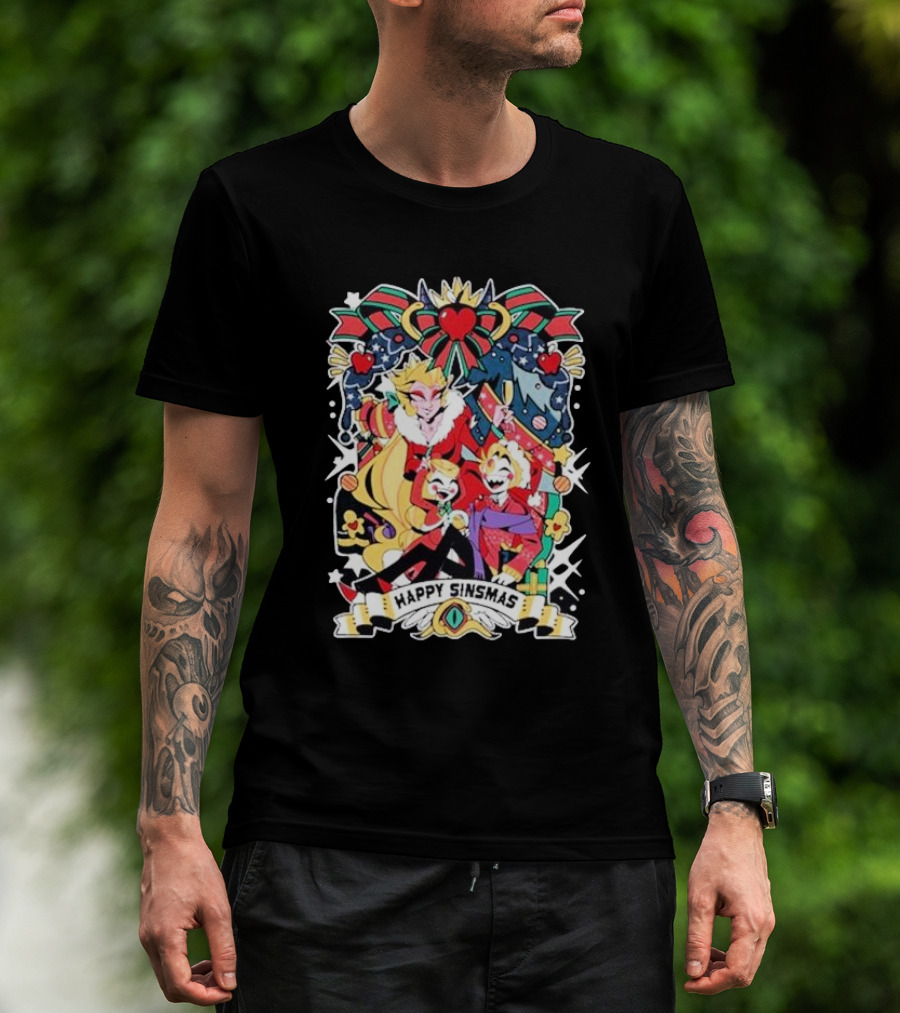 Hazbin Hotel Happy Sinsmas Christmas Celebration With Characters And Holiday Decorations T-Shirt