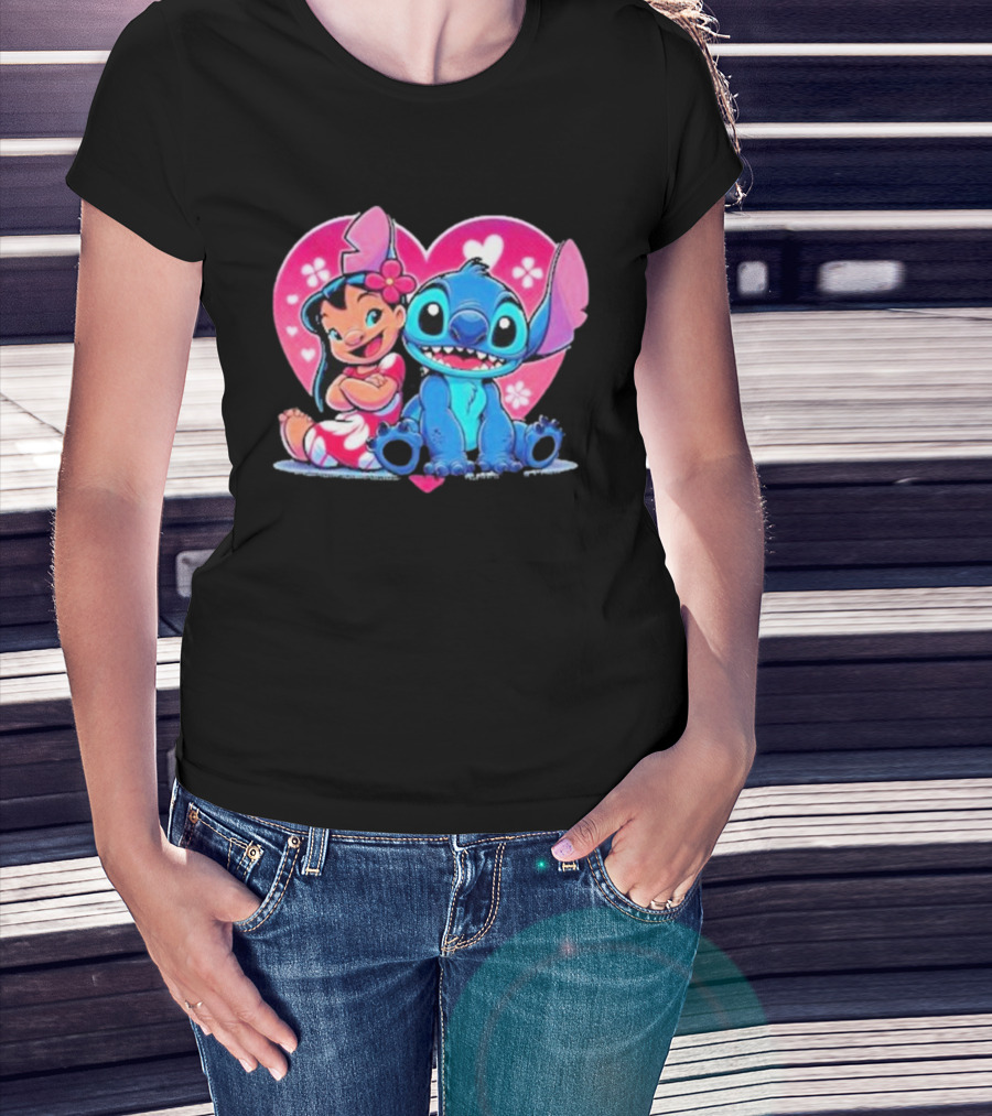 The Lilo and Stitch Heart Background Pink Flower Ears Cute Characters T-shirt is designed for everyday wear and a consistent fit. Fabric is pre-shrunk ring-spun cotton with durable stitching. See the size chart below for exact measurements.