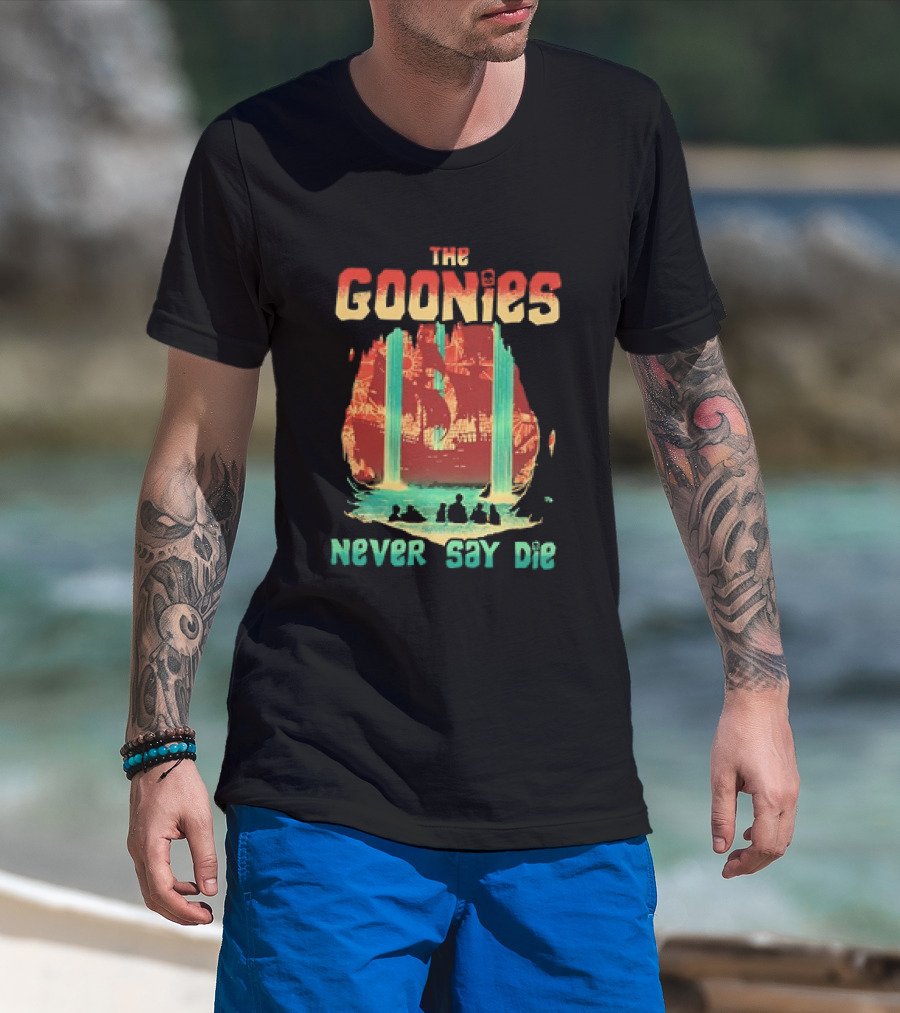 The The Goonies Never Say Die Adventure T-shirt is designed for everyday wear and a consistent fit. Fabric is pre-shrunk ring-spun cotton with durable stitching. See the size chart below for exact measurements.
