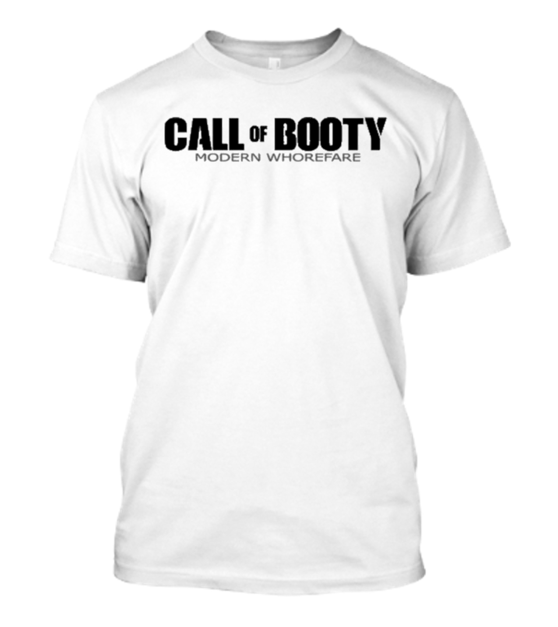 The Call Of Booty Modern Whorefare Classic Parody Text T-shirt is designed for everyday wear and a consistent fit. Fabric is pre-shrunk ring-spun cotton with durable stitching. See the size chart below for exact measurements.