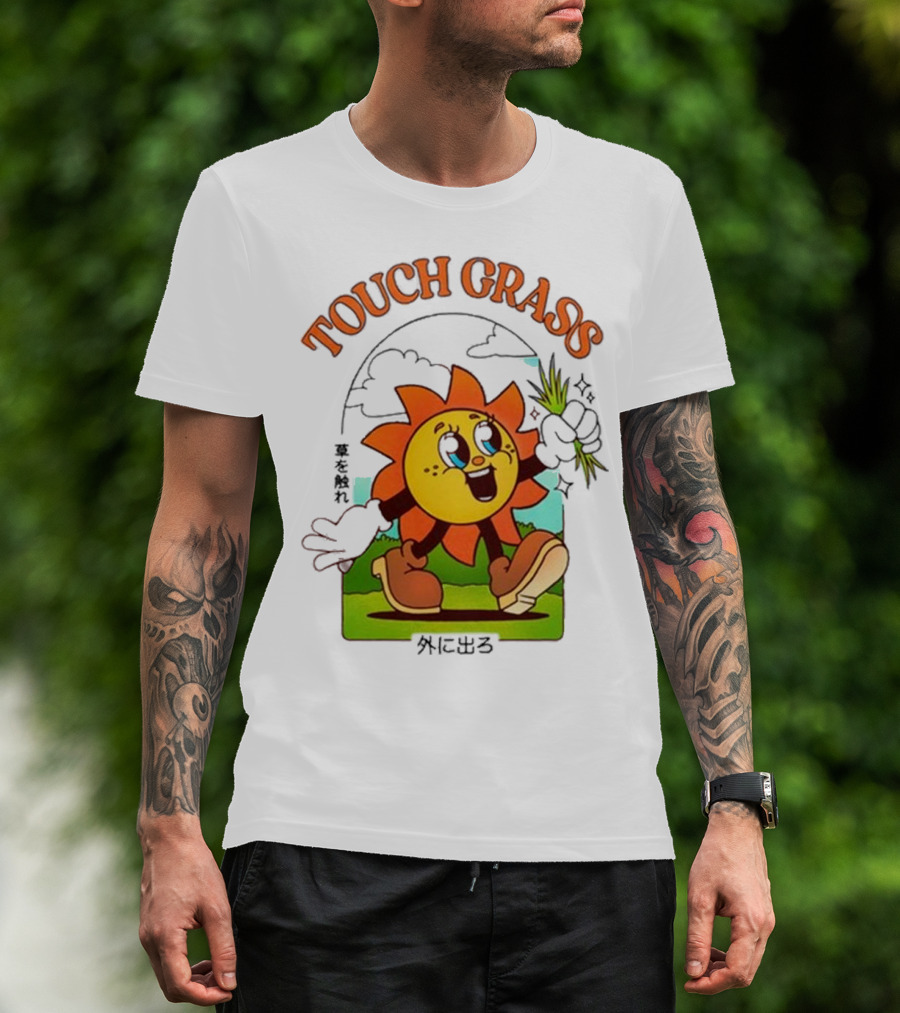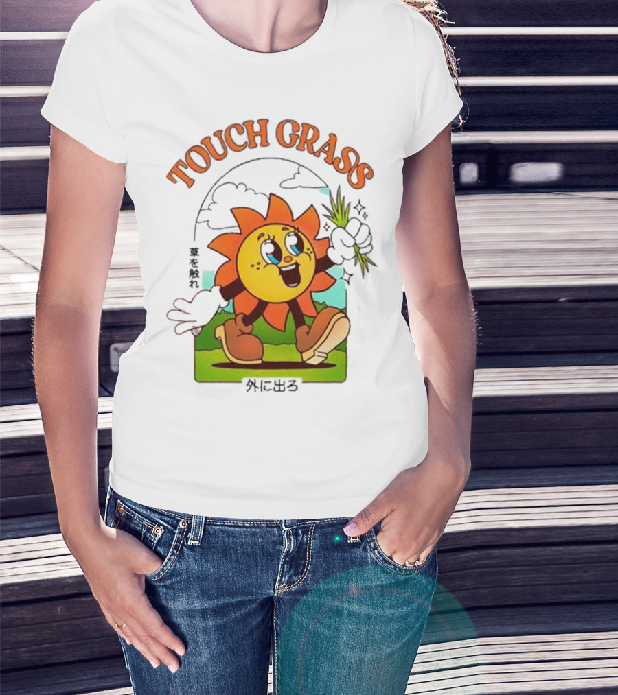 Touch Grass Retro Sun Character Outdoors Japanese Text T-Shirt