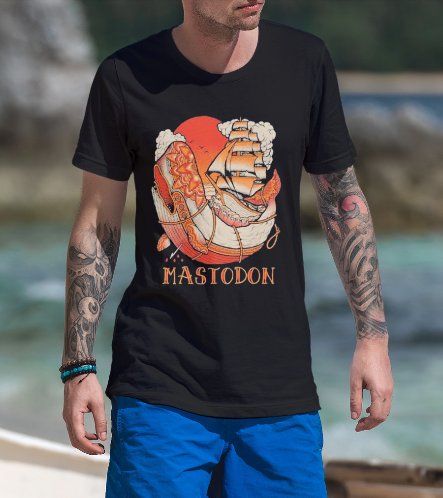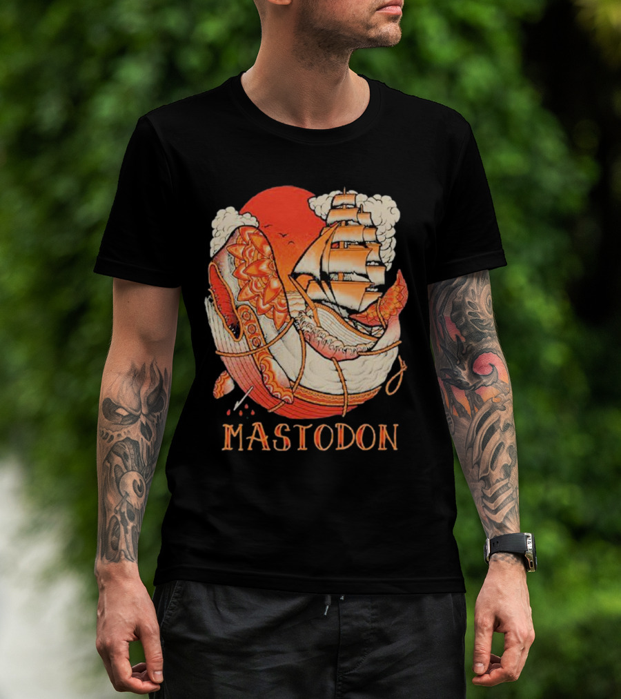 Mastodon Whale Tattoo Ship Against Red Sun T-Shirt