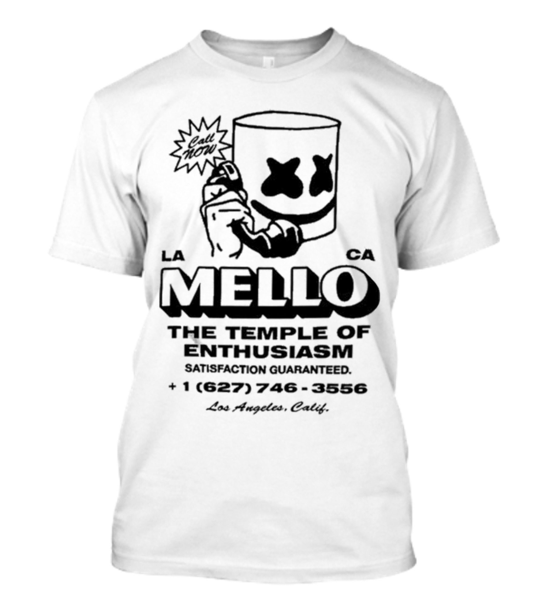 The Mello The Temple of Enthusiasm Satisfaction Guaranteed Los Angeles Calif Call Now T-shirt is designed for everyday wear and a consistent fit. Fabric is pre-shrunk ring-spun cotton with durable stitching. See the size chart below for exact measurements.