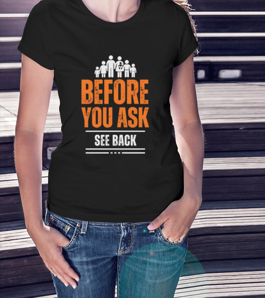 The Before You Ask See Back Family Icons T-shirt is designed for everyday wear and a consistent fit. Fabric is pre-shrunk ring-spun cotton with durable stitching. See the size chart below for exact measurements.