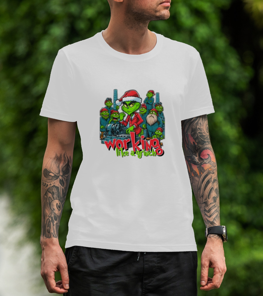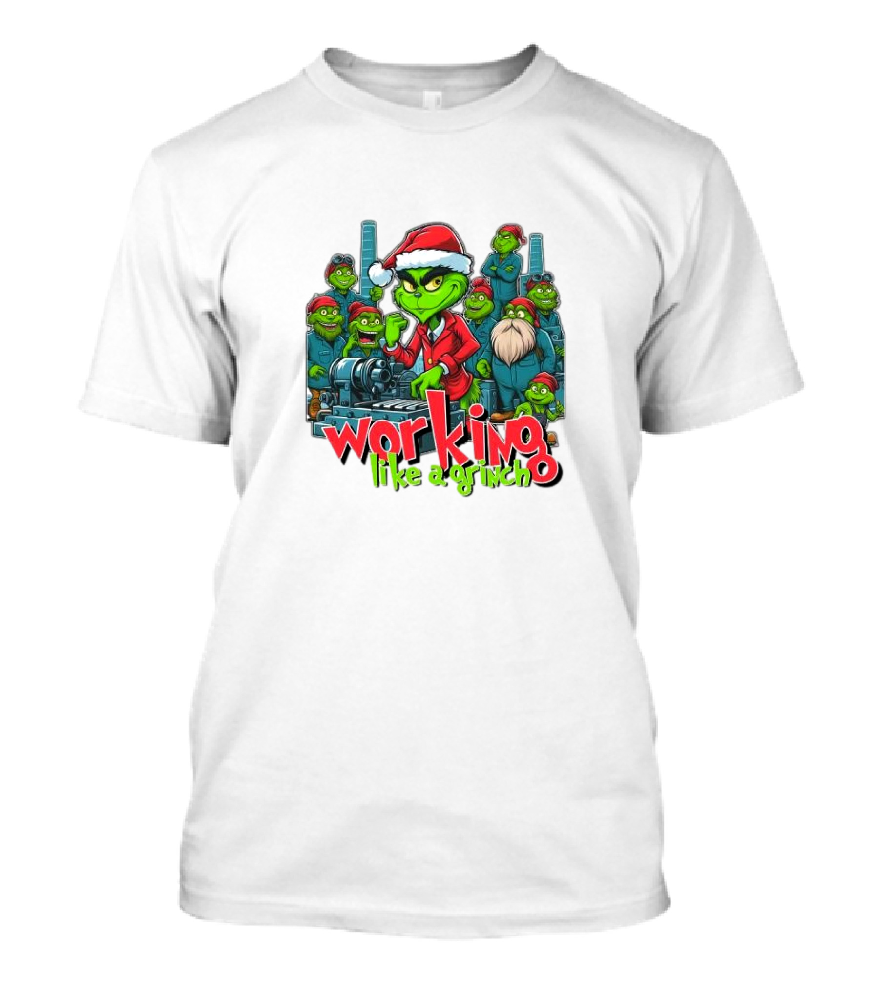 The Working Like A Grinch Merry Christmas Santa Hat Green Characters Factory Scene T-shirt is designed for everyday wear and a consistent fit. Fabric is pre-shrunk ring-spun cotton with durable stitching. See the size chart below for exact measurements.