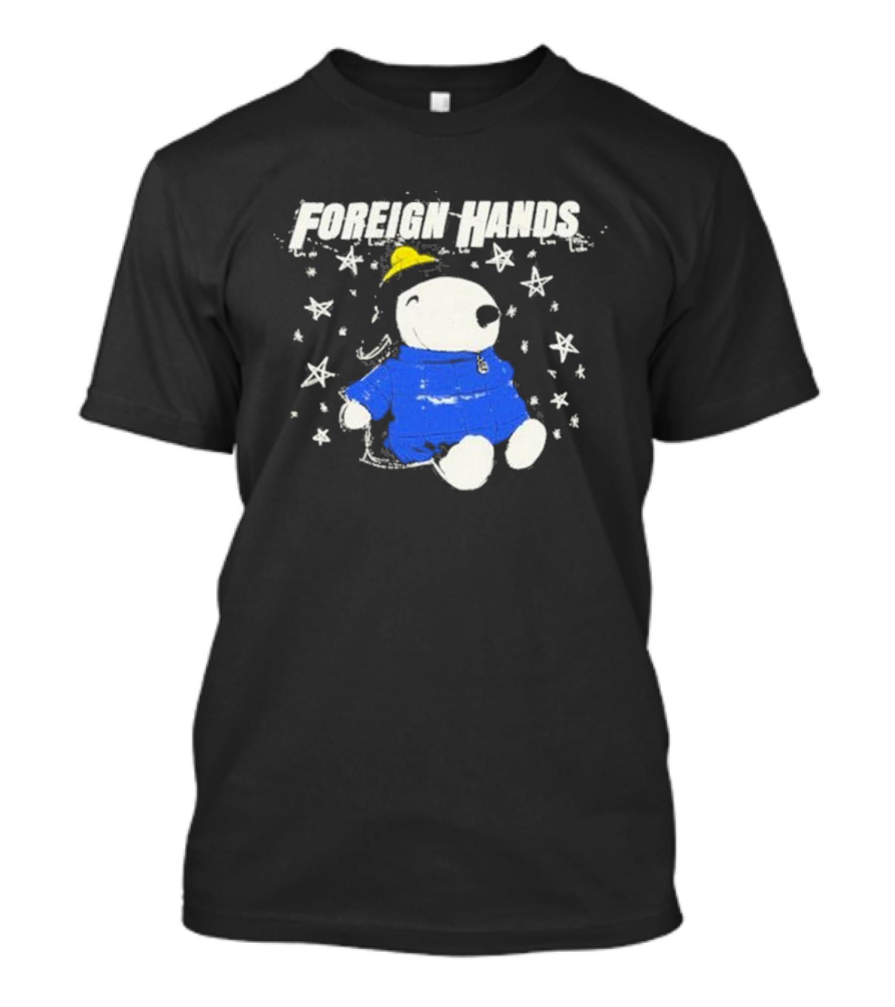 The Foreign Hands Dying Wishmas Cute Dog in Blue Jacket with Yellow Hat and Stars T-shirt is designed for everyday wear and a consistent fit. Fabric is pre-shrunk ring-spun cotton with durable stitching. See the size chart below for exact measurements.