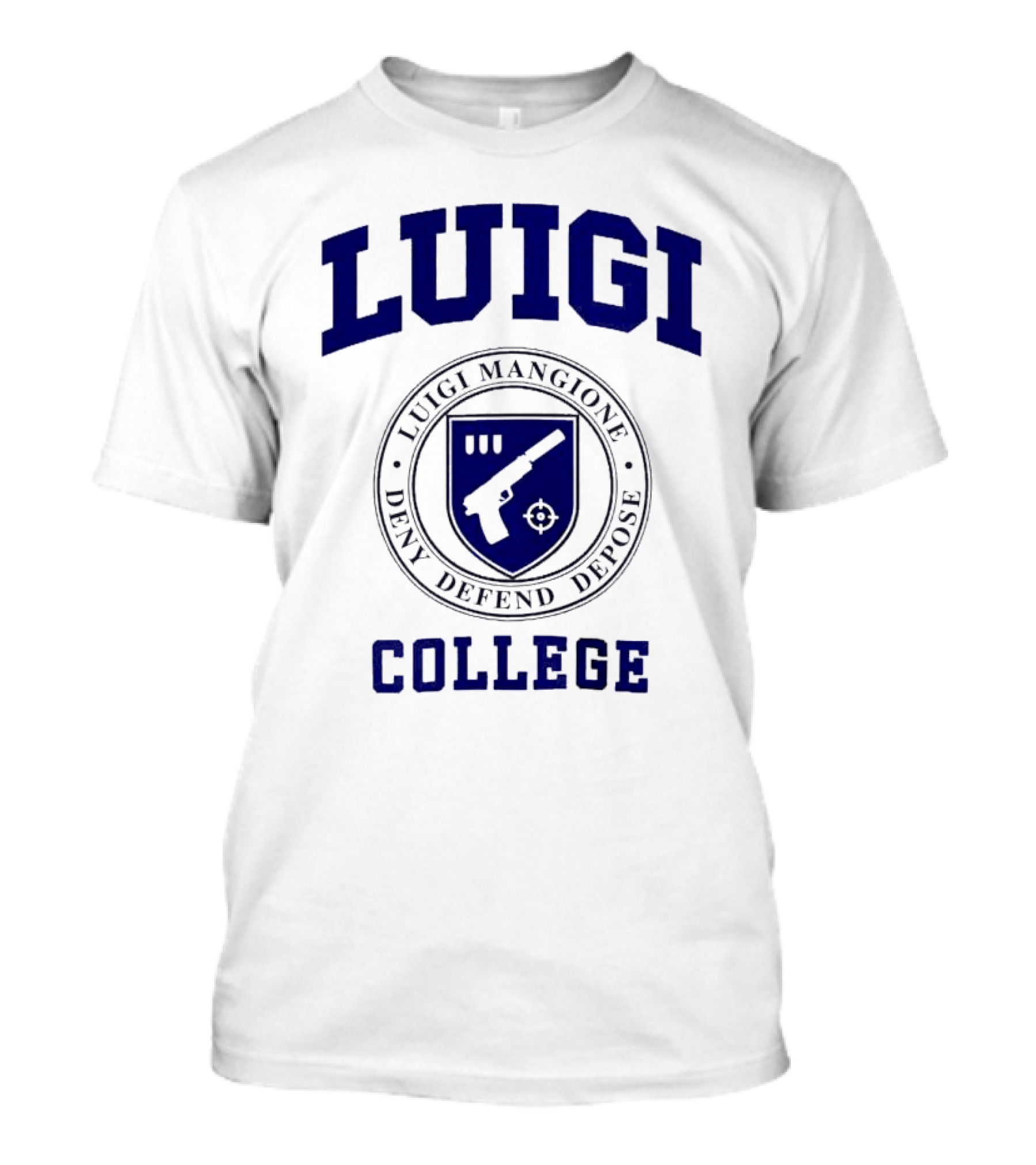 The Luigi College Luigi Mangione Deny Defend Depose Badge Emblem T-shirt is designed for everyday wear and a consistent fit. Fabric is pre-shrunk ring-spun cotton with durable stitching. See the size chart below for exact measurements.