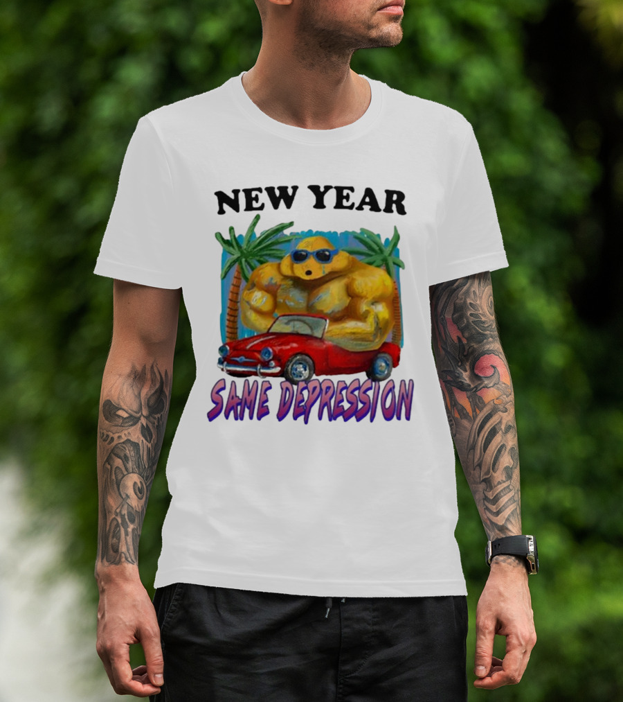 The New Year Same Depression Buff Duck Red Convertible Palm Trees T-shirt is designed for everyday wear and a consistent fit. Fabric is pre-shrunk ring-spun cotton with durable stitching. See the size chart below for exact measurements.