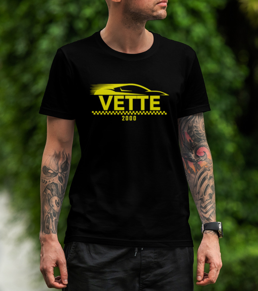 Vette 2000 Sports Car Yellow Silhouette And Checkered Stripe T-Shirt