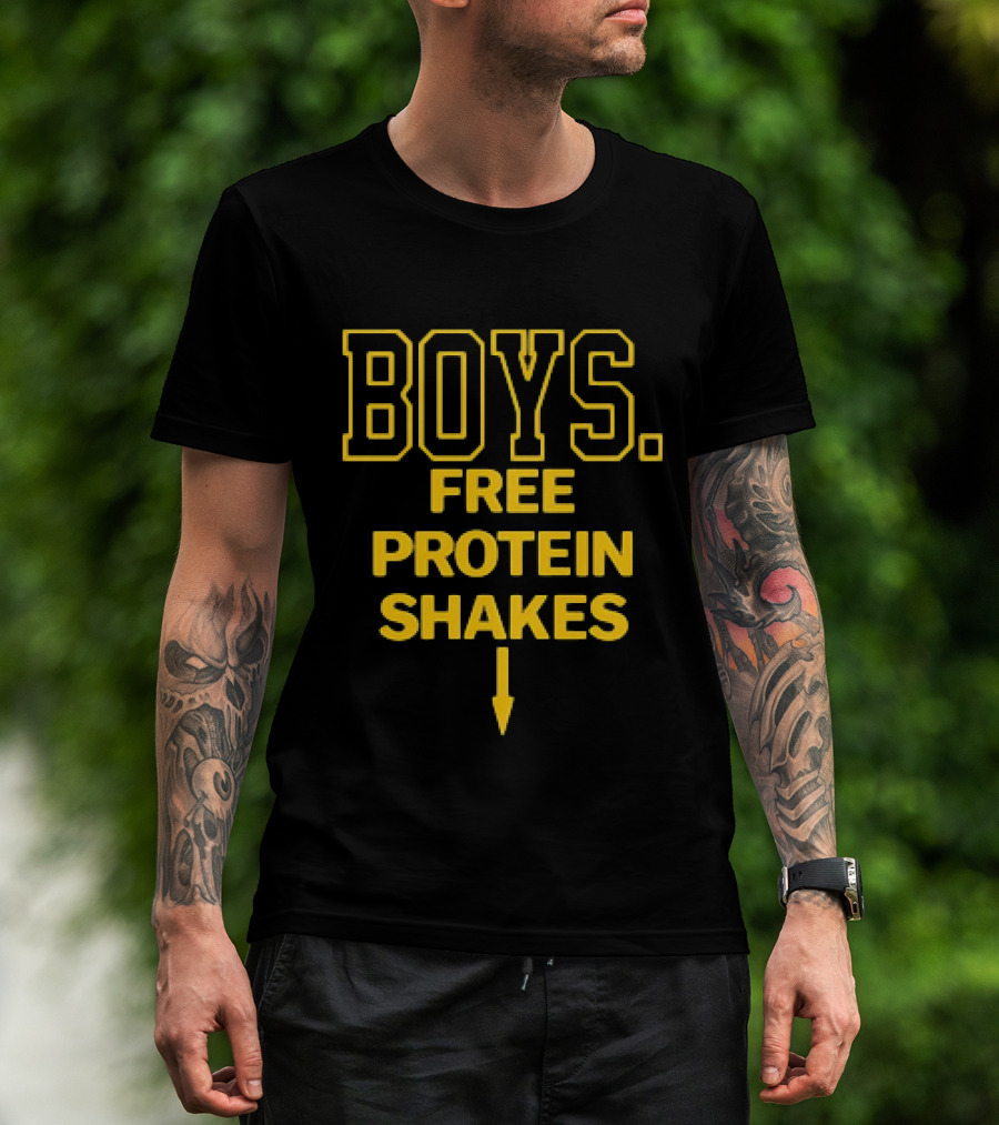 The BOYS Free Protein Shakes Arrow T-shirt is designed for everyday wear and a consistent fit. Fabric is pre-shrunk ring-spun cotton with durable stitching. See the size chart below for exact measurements.