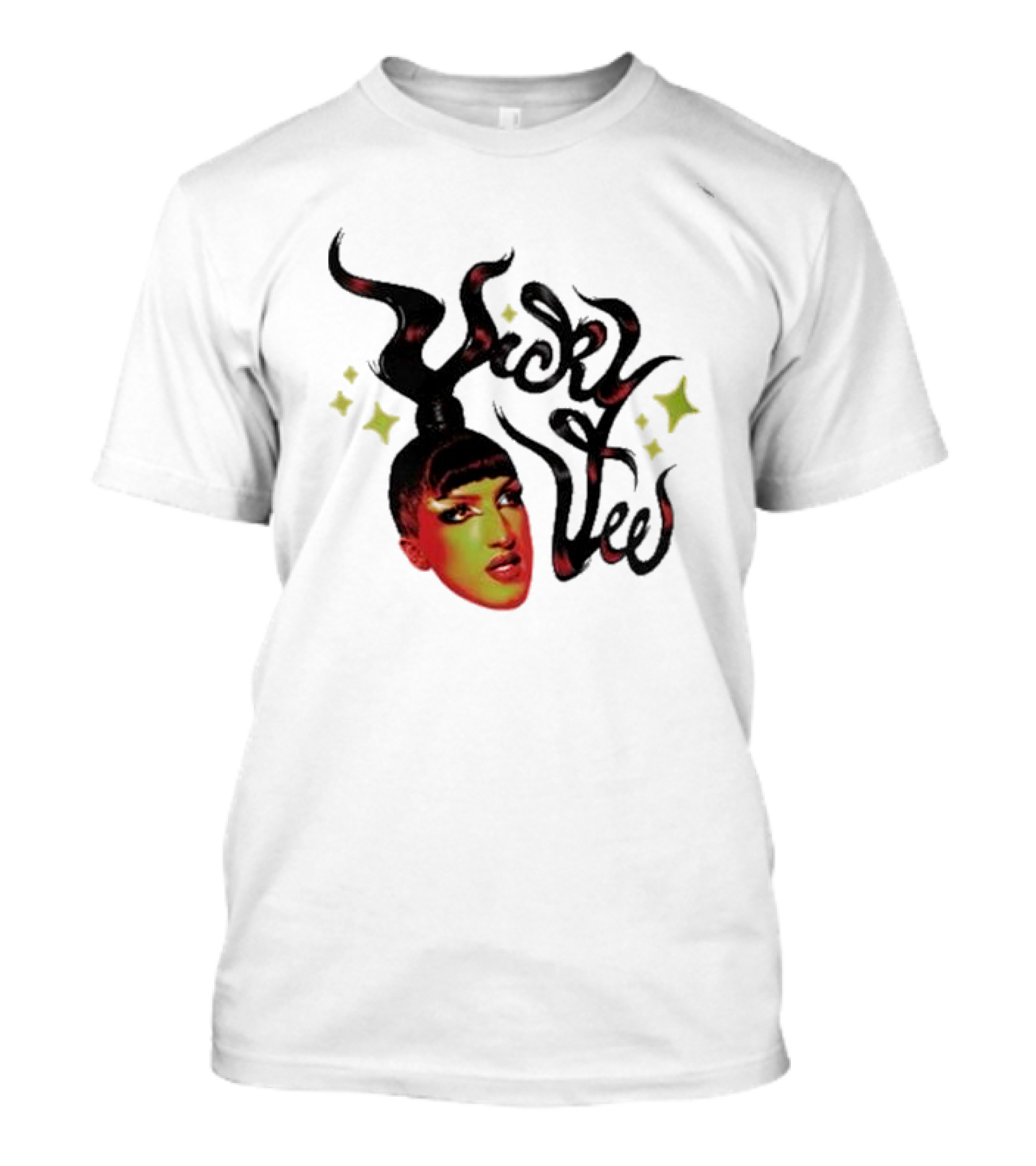 The Vicky Vee Stylized Portrait with Hair Calligraphy and Star Accents T-shirt is designed for everyday wear and a consistent fit. Fabric is pre-shrunk ring-spun cotton with durable stitching. See the size chart below for exact measurements.