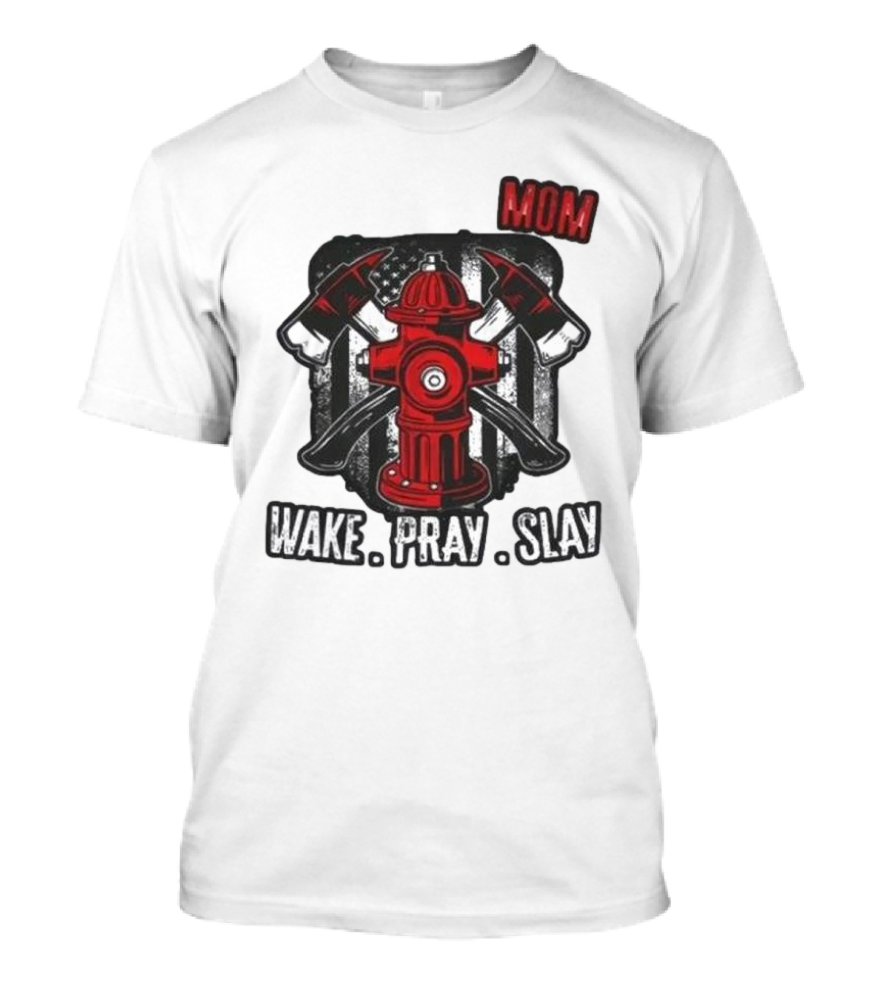 The California Wildfire Firefighter Mom Wake Pray Slay Hydrant Axes U.S. Flag T-shirt is designed for everyday wear and a consistent fit. Fabric is pre-shrunk ring-spun cotton with durable stitching. See the size chart below for exact measurements.
