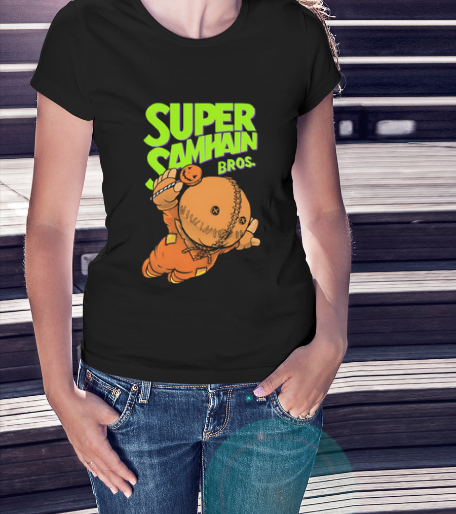 Super Samhain Bros Trick ‘r Treat Sam Icon In Pumpkin Suit With Green And Orange Highlights T-Shirt