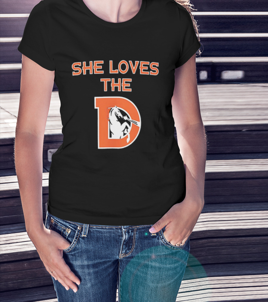 The Denver Broncos She Loves the D Football Team T-shirt is designed for everyday wear and a consistent fit. Fabric is pre-shrunk ring-spun cotton with durable stitching. See the size chart below for exact measurements.