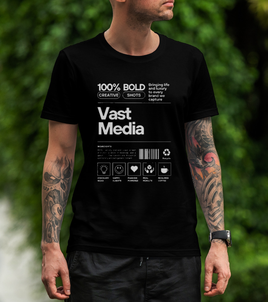 The 100% Bold Creative Shots Bringing Life and Luxury to Every Brand We Capture Vast Media Visionary Ideas Happy Clients Passion-Powered Real Results Requires Coffee T-shirt is designed for everyday wear and a consistent fit. Fabric is pre-shrunk ring-spun cotton with durable stitching. See the size chart below for exact measurements.