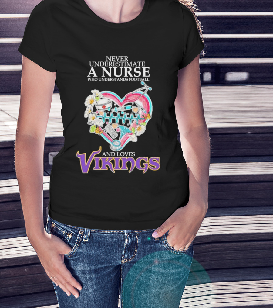 Never Underestimate A Nurse Who Understands Football And Loves Vikings Football Team Heartbeat T-Shirt