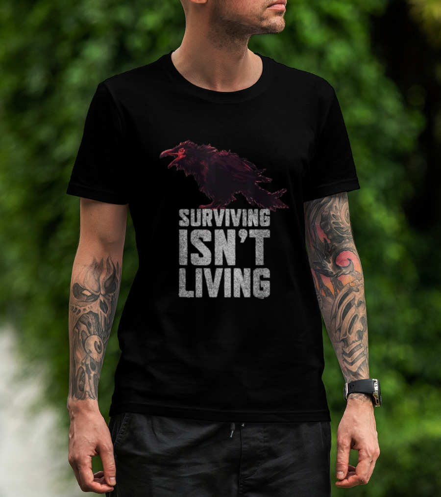 Surviving Isn’t Living Crow Phrase With Dark Bird Illustration T-Shirt
