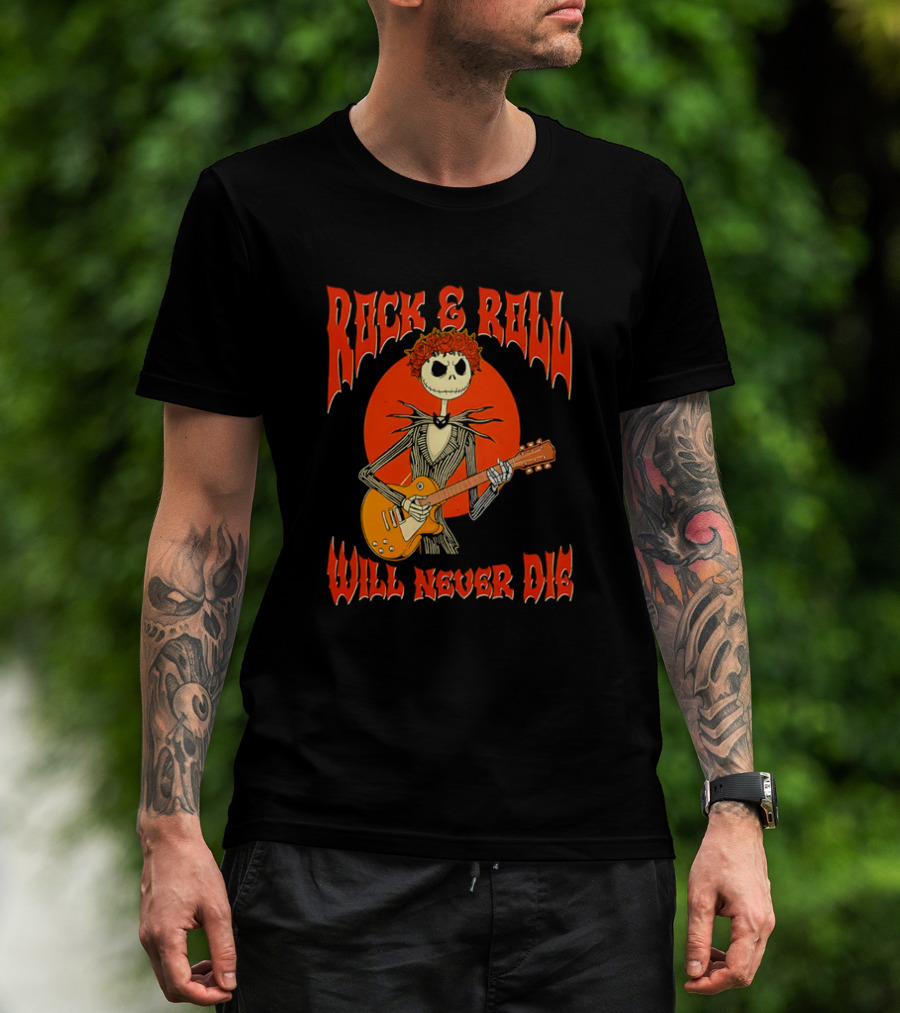 Rock And Roll Will Never Die Jack Skellington Playing Guitar T-Shirt