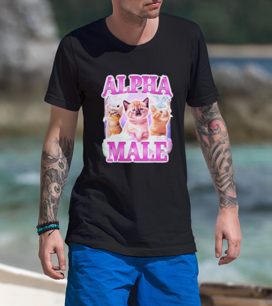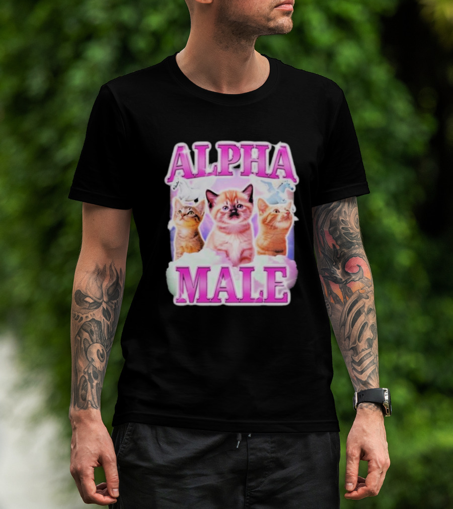 The Alpha Male Cat Trio with Rainbow Unicorns and Clouds T-shirt is designed for everyday wear and a consistent fit. Fabric is pre-shrunk ring-spun cotton with durable stitching. See the size chart below for exact measurements.