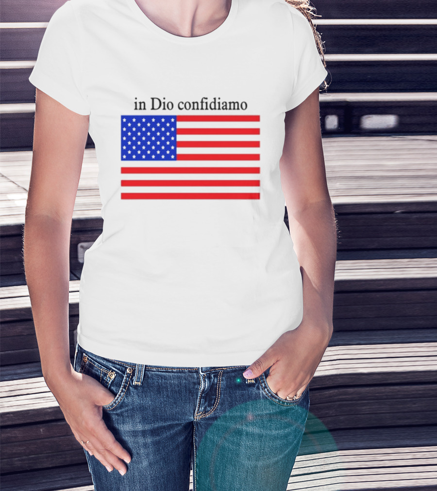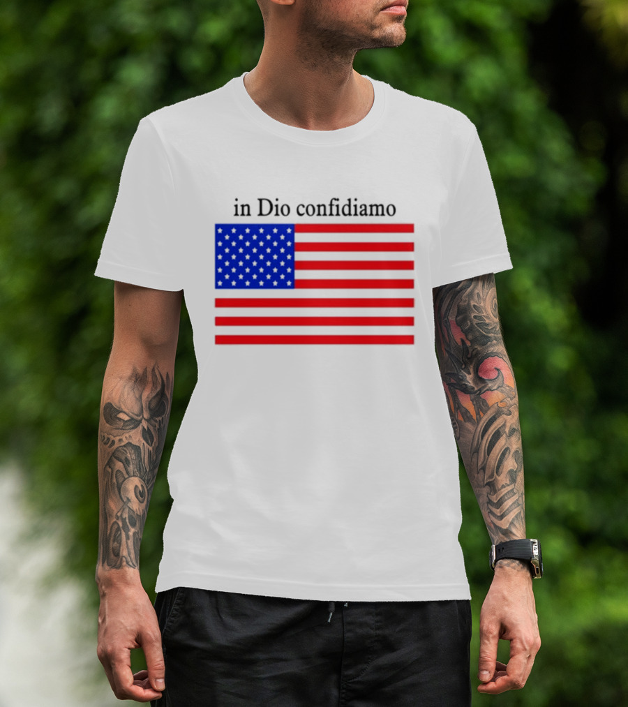 The Eric Adams Wearing In Dio Confidiamo T-shirt is designed for everyday wear and a consistent fit. Fabric is pre-shrunk ring-spun cotton with durable stitching. See the size chart below for exact measurements.