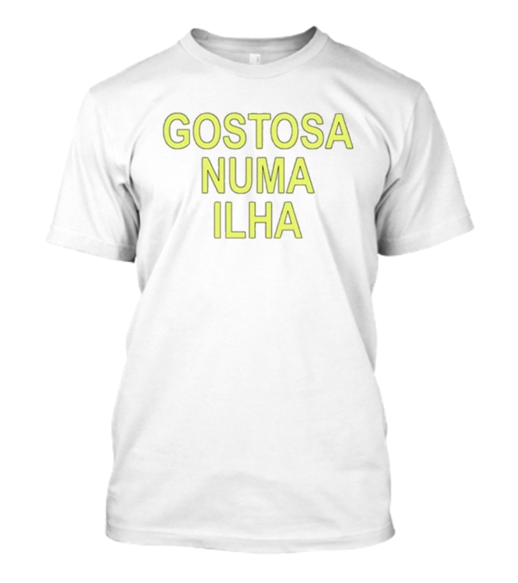 The Gostosa Numa Ilha Green Bold Text T-shirt is designed for everyday wear and a consistent fit. Fabric is pre-shrunk ring-spun cotton with durable stitching. See the size chart below for exact measurements.