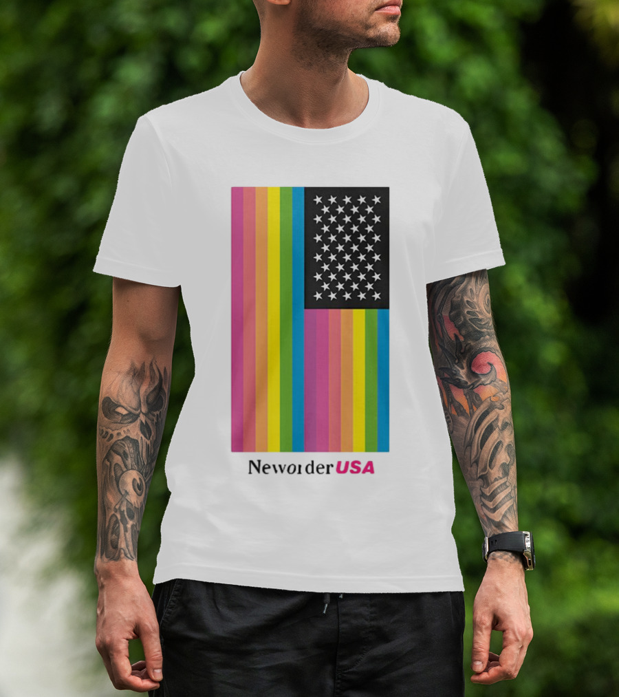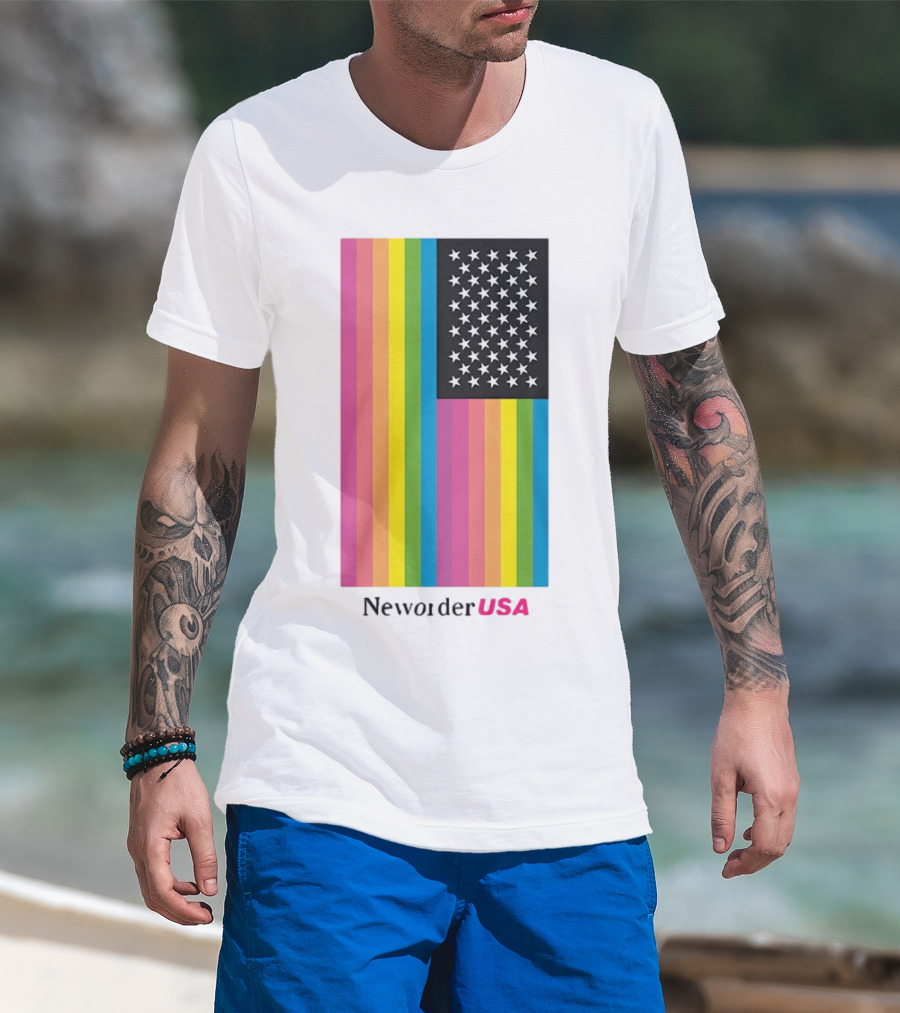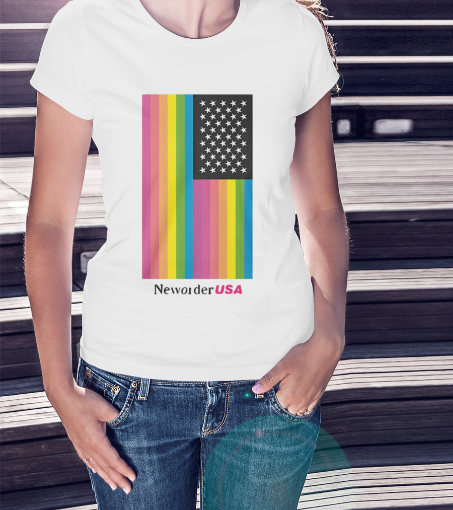 The New Order USA Rainbow Flag Stars T-shirt is designed for everyday wear and a consistent fit. Fabric is pre-shrunk ring-spun cotton with durable stitching. See the size chart below for exact measurements.