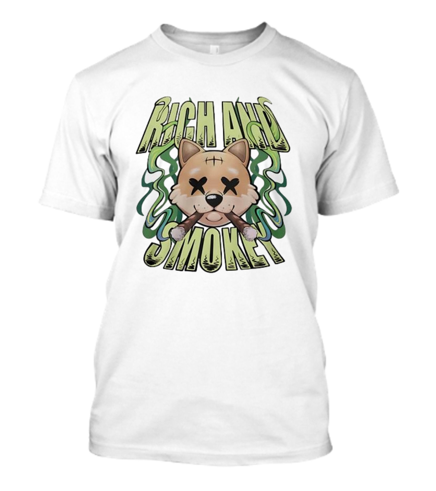 The Rich and Smokey Shiba Inu with Crossed Eyes and Cigars T-shirt is designed for everyday wear and a consistent fit. Fabric is pre-shrunk ring-spun cotton with durable stitching. See the size chart below for exact measurements.