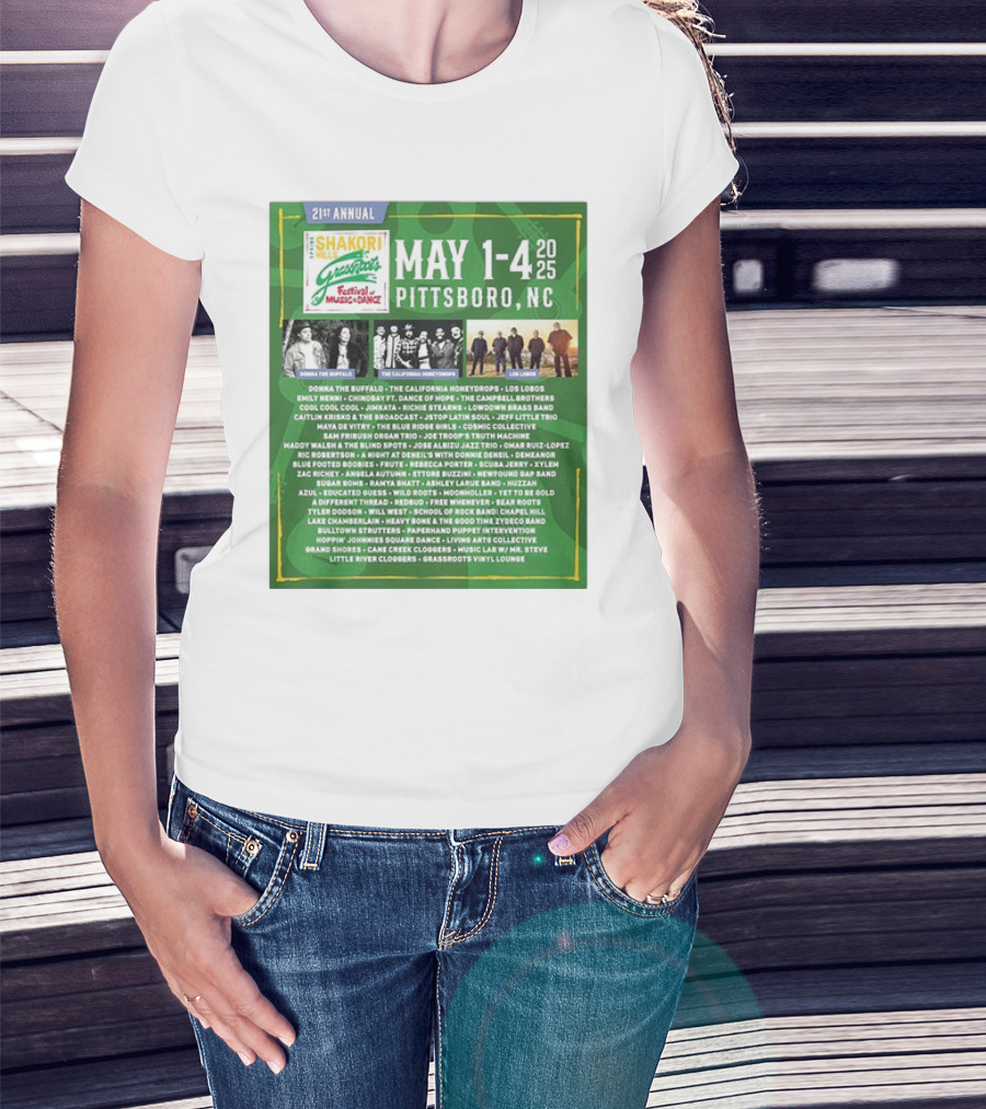 21st Annual Shakori Hills Grassroots Festival Music Dance May 1-4 2025 Pittsboro NC Donna The Buffalo The California Honeydrops Los Lobos T-Shirt