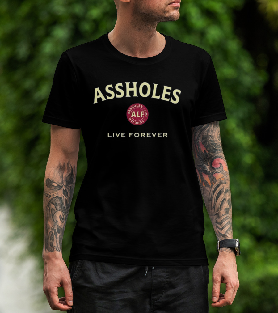 The ASSHOLES ALF Live Forever T-shirt is designed for everyday wear and a consistent fit. Fabric is pre-shrunk ring-spun cotton with durable stitching. See the size chart below for exact measurements.