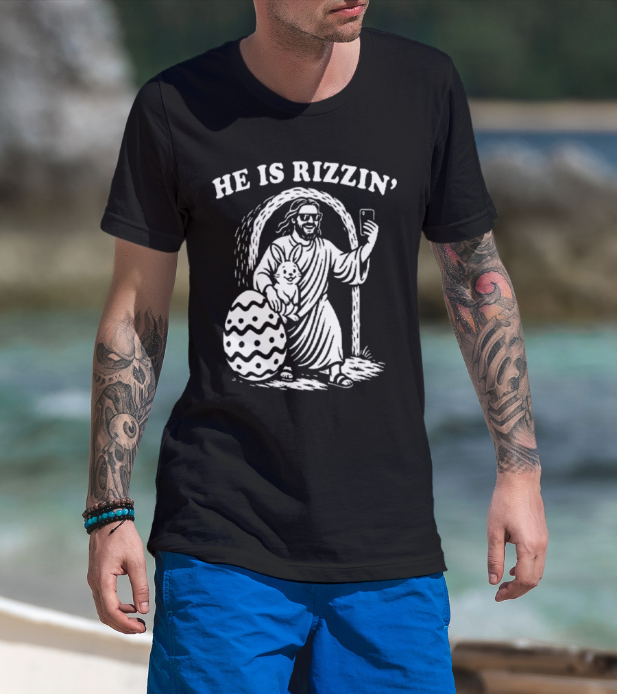 He Is Rizzin Jesus With Bunny And Easter Egg Selfie T-Shirt