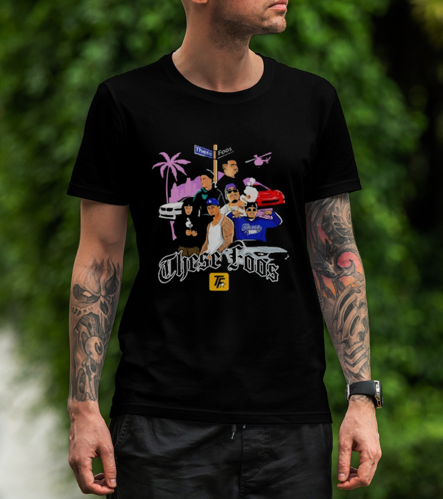 The These Foos Street Style San Andreas Characters Palm Tree Helicopter Cars T-shirt is designed for everyday wear and a consistent fit. Fabric is pre-shrunk ring-spun cotton with durable stitching. See the size chart below for exact measurements.
