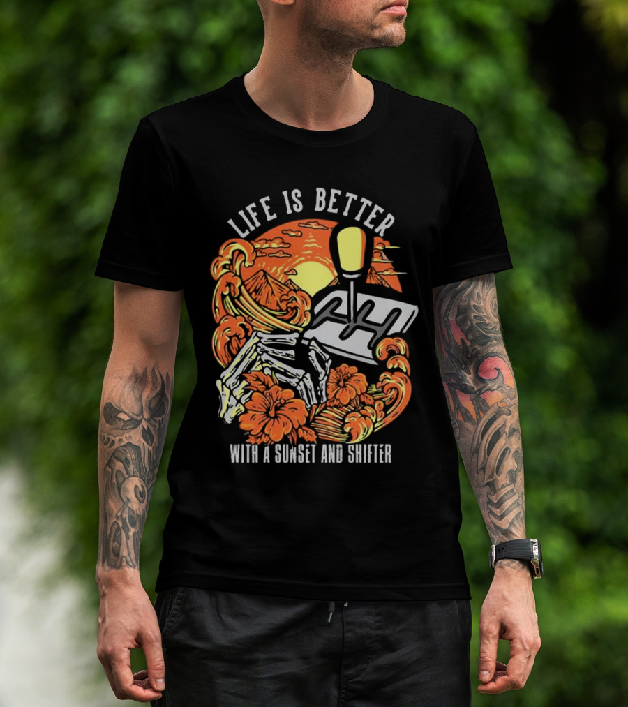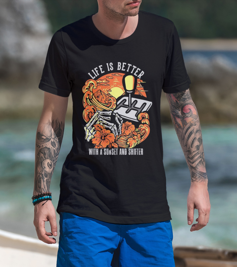 Life Is Better With A Sunset And Shifter Orange Skeleton Floral Waves T-Shirt