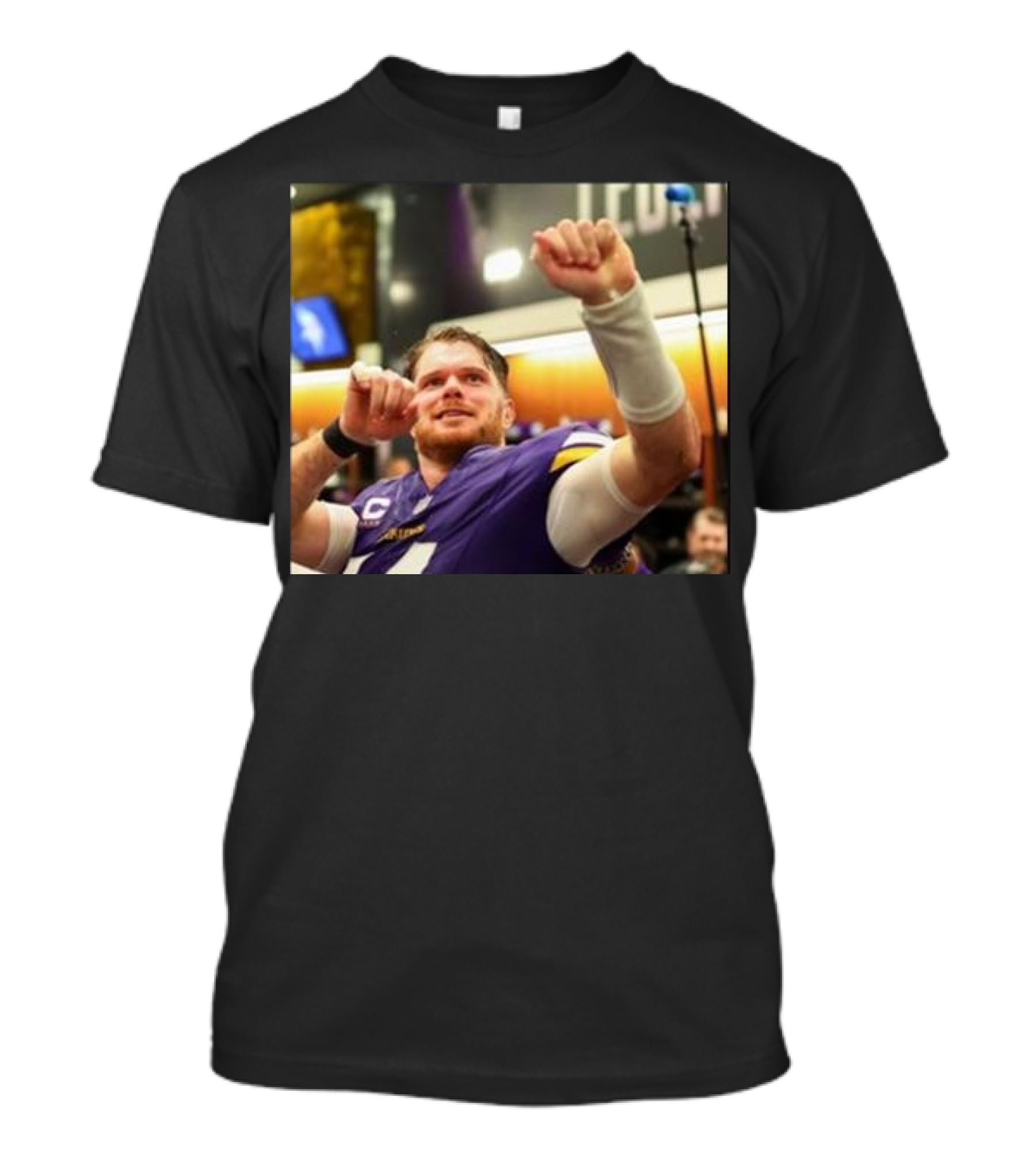 The Vikings Locker Room Celebration with Sam Darnold in Jersey T-shirt is designed for everyday wear and a consistent fit. Fabric is pre-shrunk ring-spun cotton with durable stitching. See the size chart below for exact measurements.