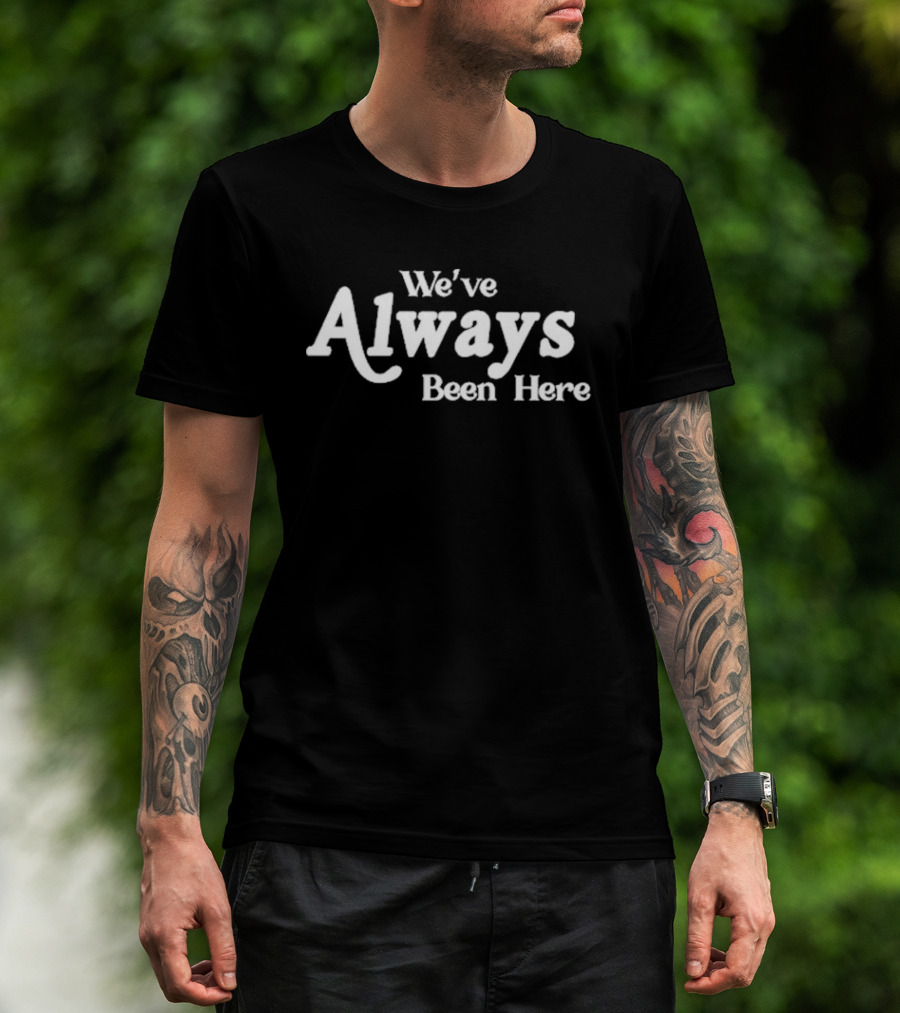 The We've Always Been Here T-shirt is designed for everyday wear and a consistent fit. Fabric is pre-shrunk ring-spun cotton with durable stitching. See the size chart below for exact measurements.