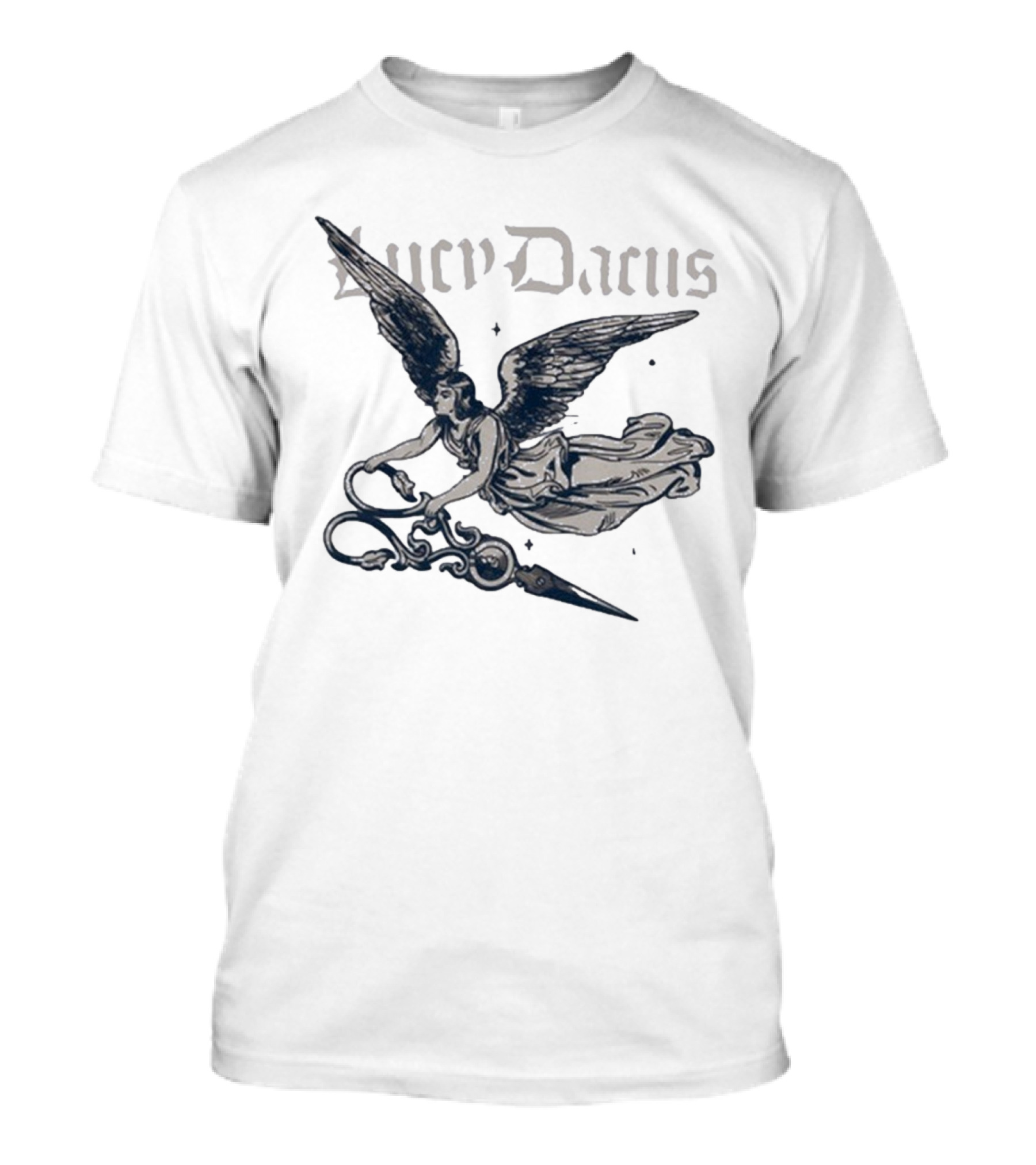 The Lucy Dacus Angel Wings Holding Scissors T-shirt is designed for everyday wear and a consistent fit. Fabric is pre-shrunk ring-spun cotton with durable stitching. See the size chart below for exact measurements.
