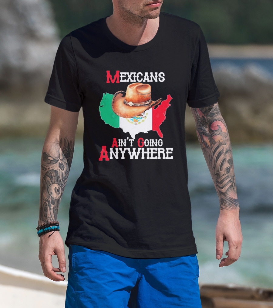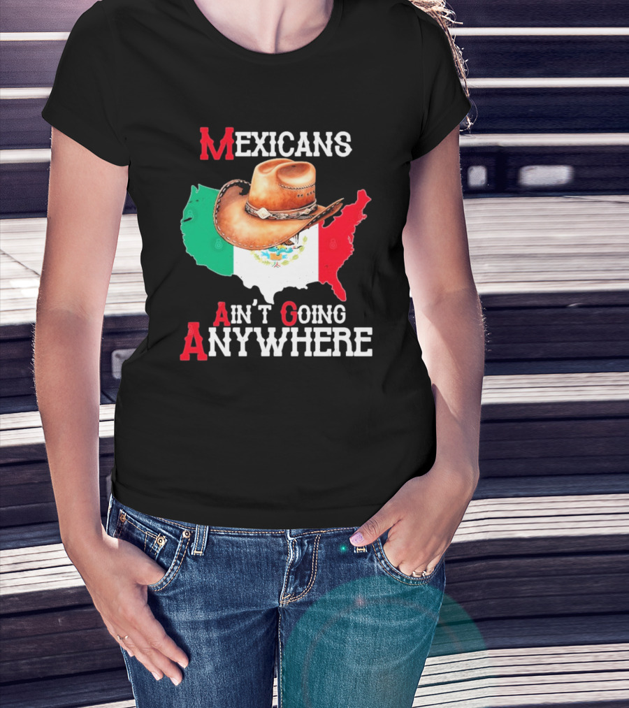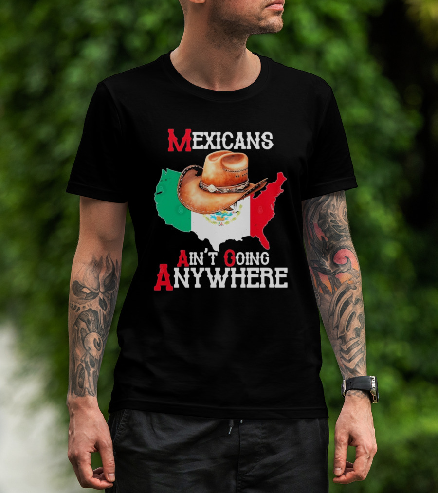 Mexicans Ain't Going Anywhere Map With Cowboy Hat And Flag Design T-Shirt