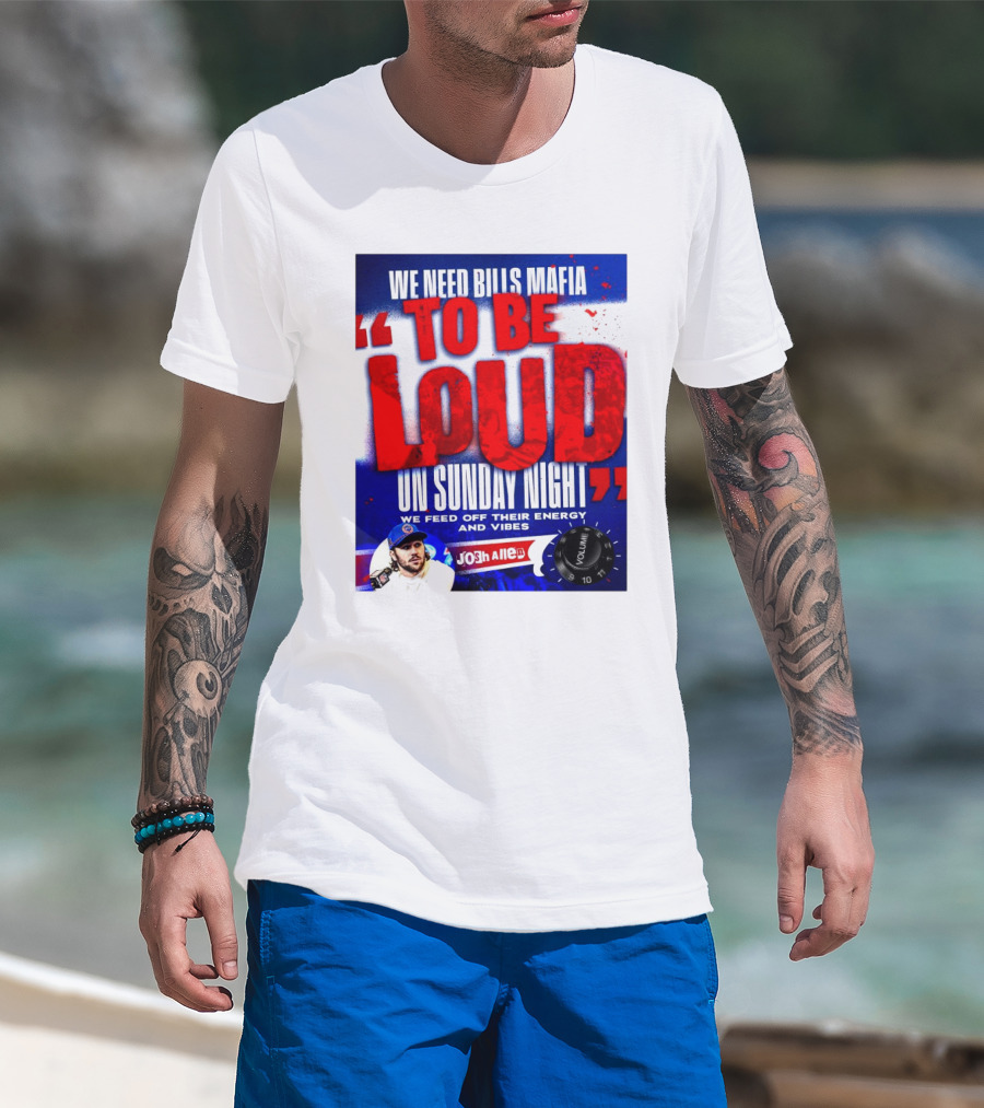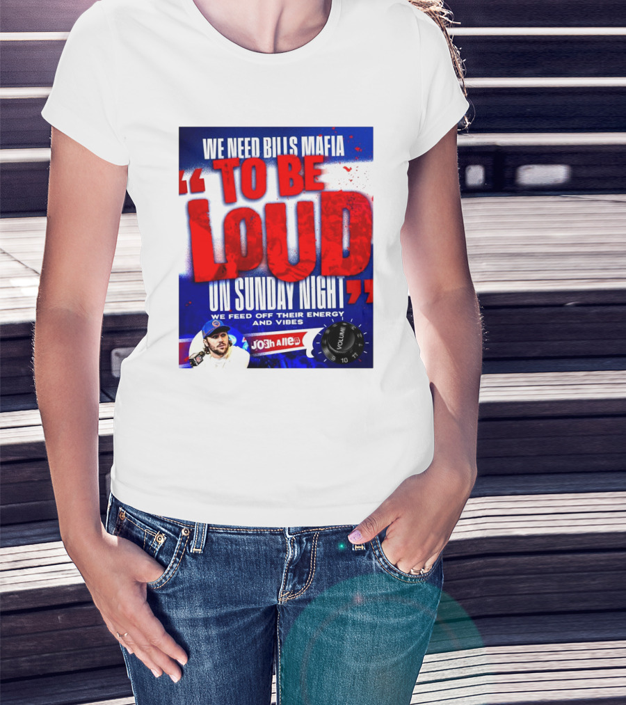 The We Need Bills Mafia To Be Loud On Sunday Night We Feed Off Their Energy And Vibes Josh Allen Volume T-shirt is designed for everyday wear and a consistent fit. Fabric is pre-shrunk ring-spun cotton with durable stitching. See the size chart below for exact measurements.